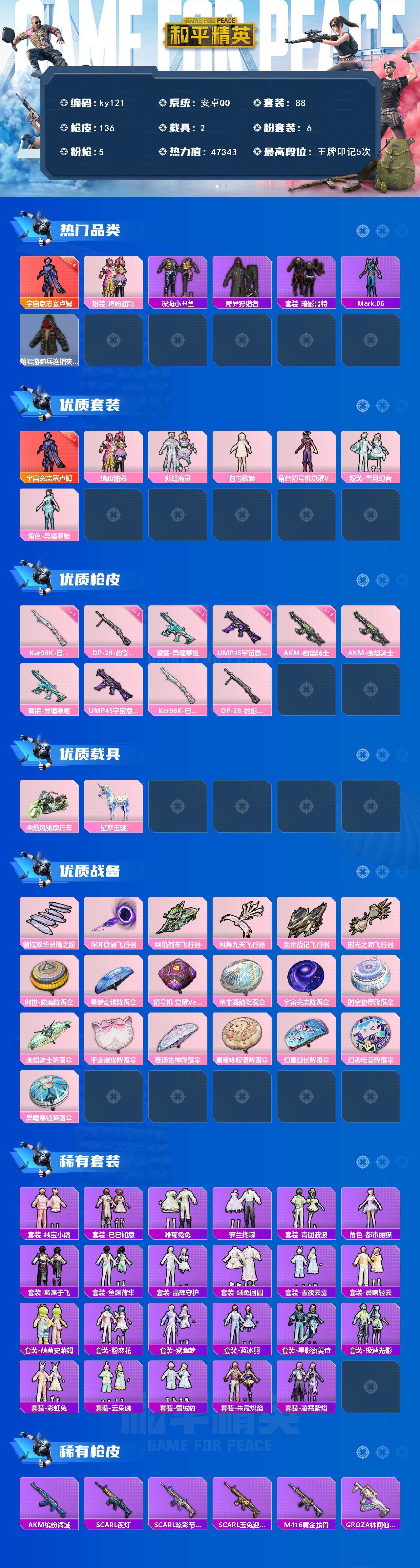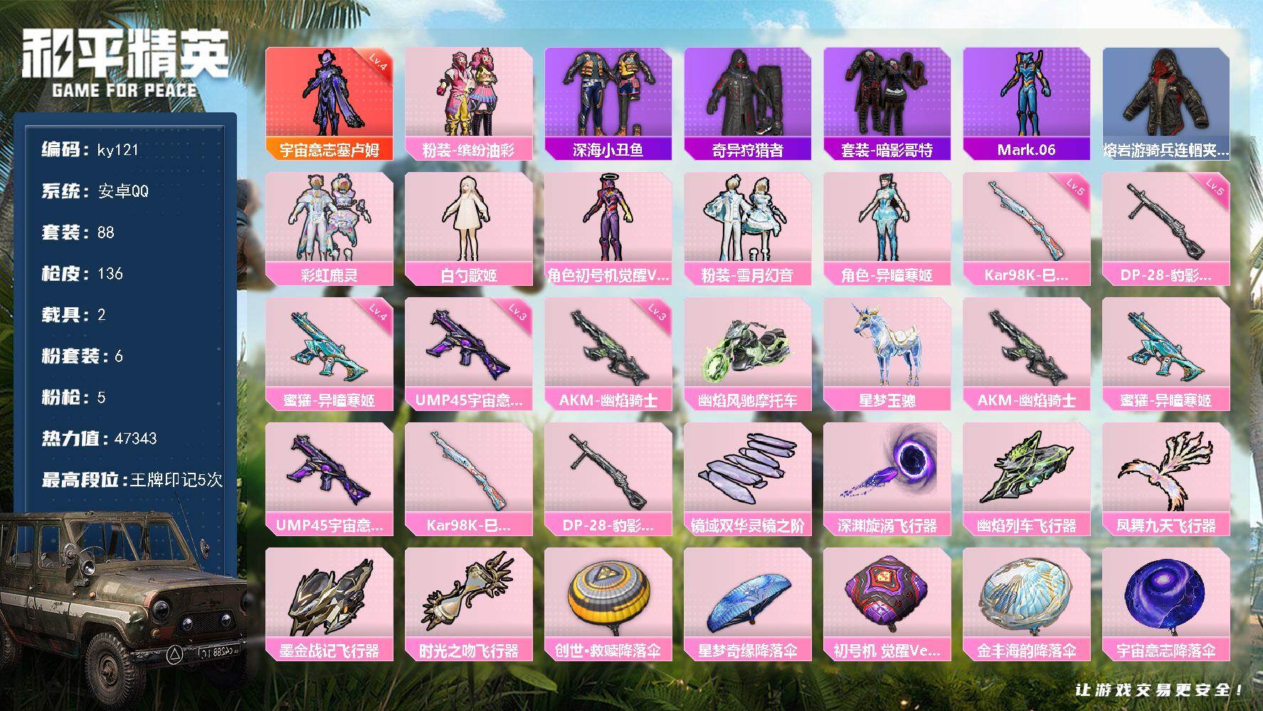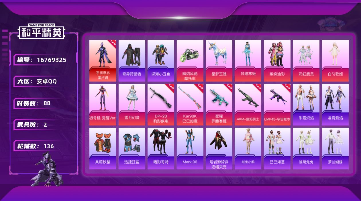 [16769325]安卓 手Q-1神装-6粉装-5特效枪-2载具-6粉色飞行器-47343热力值-5王牌印记-88套装-136枪皮