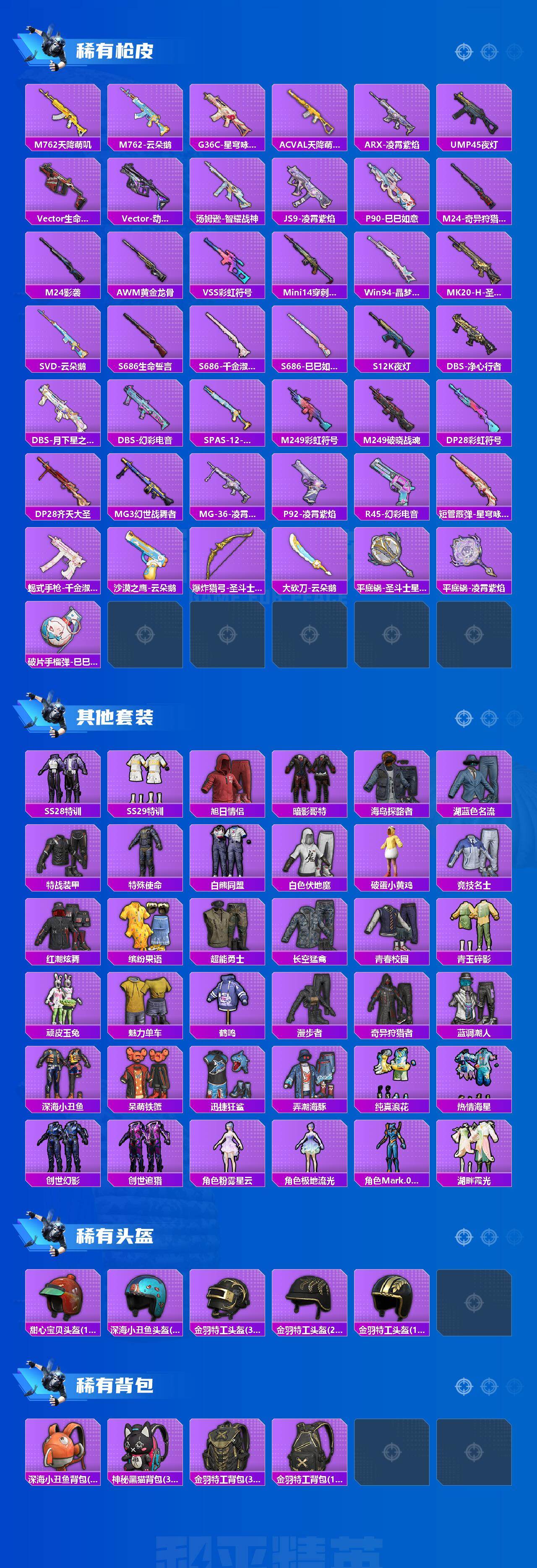 【稀有枪皮】:AKM-缤纷海域,SCAR-L-夜灯,SCAR-L-炫彩节奏,SCAR-L-玉兔迎春,M416-黄金龙骨,GROZA-林间仙鹿,M762-天降萌叽,M762-云朵鹅,G36C-星穹咏叹调,AC-VAL-天降萌叽,ARX-凌霄紫焰,UMP45-夜灯,Vector-生命誓言,Vector-动力核心,汤姆逊-智耀战神,JS9-凌霄紫焰,P90-巳巳如意,M24-影袭,M24-奇异狩猎者,AWM-黄金龙骨,VSS-彩虹符号,Mini14-穿刺龙虾,Win94-晶梦幻蝶,MK20-H-圣域