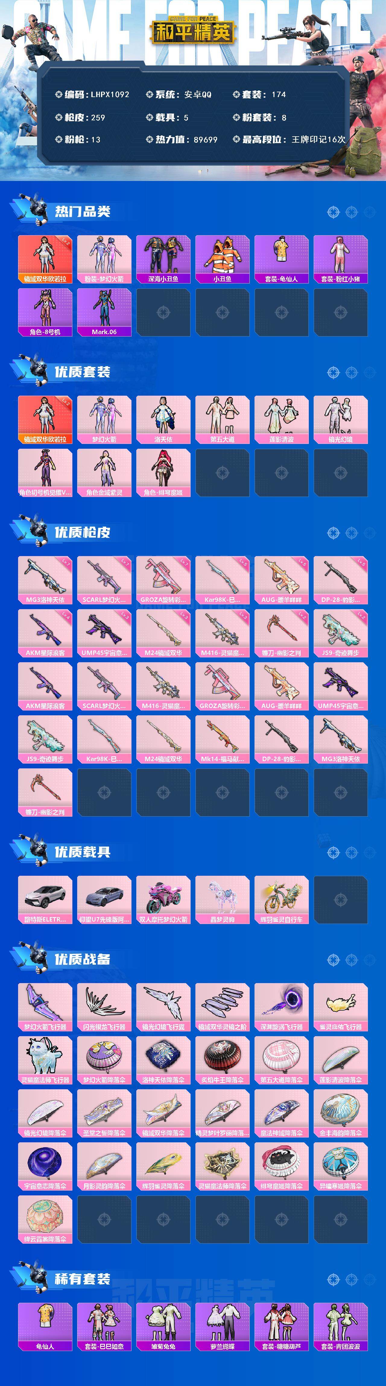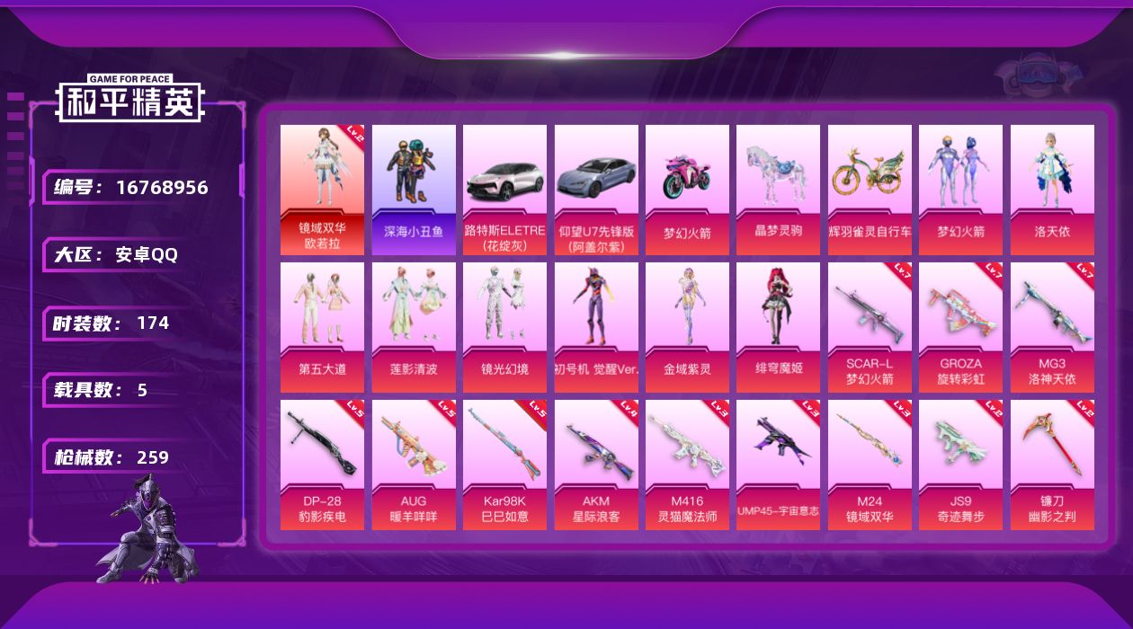 [16768956]【店主推荐捡漏号!可直接换绑】安卓 手Q-1神装-8粉装-13特效枪-5载具-7粉色飞行器-89699热力值-16王牌印记-174套装-259枪皮【红色神装等级】:镜域双华-欧若拉(二级)【红色角色神装】:镜域双华-欧若拉【热门品类】:粉装-梦幻火箭,套装-深海小丑鱼,套装-小丑鱼,套装-龟仙人,套装-粉红小猪,角色-8号机,角色-Mark.06【粉色套装】:粉装-梦幻火箭,角色-洛天依,粉装-第五大道,粉装-莲影清波,粉装-镜光幻境,角色-初号机 觉醒Ver.,角色-金域紫灵,角色-绯穹魔姬【粉色枪皮等级】:AKM-星际浪客(四级),SCAR-L-梦幻火箭(七级),M416-灵猫魔法师(三级),GROZA-旋转彩虹(七级),AUG-暖羊咩咩(五级),UMP45-宇宙意志(三级),JS9-奇迹舞步(二级),Kar98K-巳巳如意(五级),M24-镜域双华(三级),DP-28-豹影疾电(五级),MG3-洛神天依(七级),镰刀-幽影之判(二级)【粉色载具】:路特斯ELETRE(花绽灰),仰望U7(阿盖尔紫),双人摩托-梦幻火箭,晶梦灵驹,辉羽雀灵自行车【粉色枪皮】:AKM-星际浪客,SCAR-L-梦幻火箭,M416-灵猫魔法师,GROZA-旋转彩虹,AUG-暖羊咩咩,UMP45-宇宙意志,JS9-奇迹舞步,Kar98K-巳巳如意,M24-镜域双华,Mk14-福马献瑞,DP-28-豹影疾电,MG3-洛神天依,镰刀-幽影之判【粉色飞行器】:梦幻火箭飞行器,闪光银龙飞行器,镜光幻境飞行翼,镜域双华-灵镜之阶,深渊漩涡飞行器,雀灵庇佑飞行器,灵猫魔法师飞行器