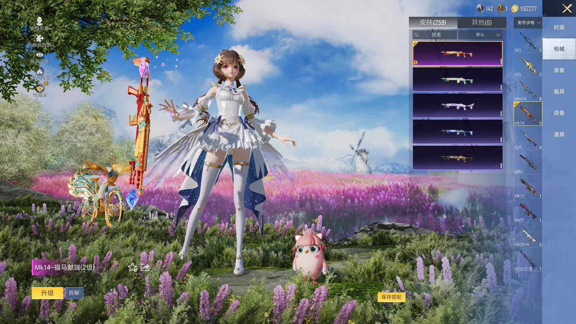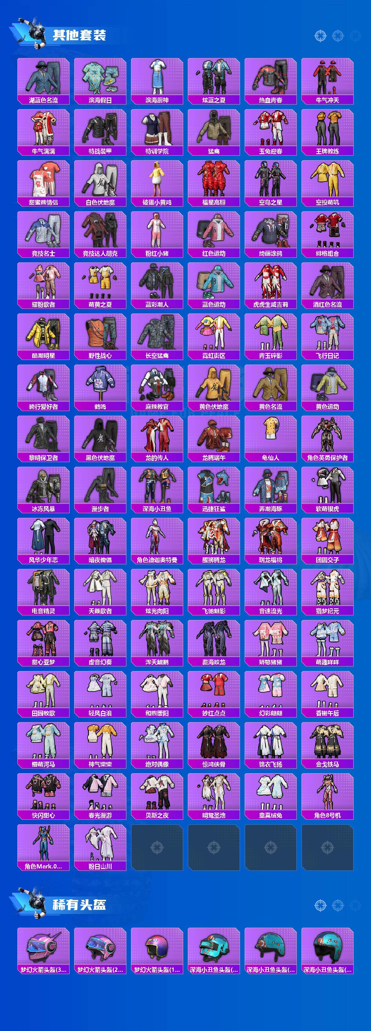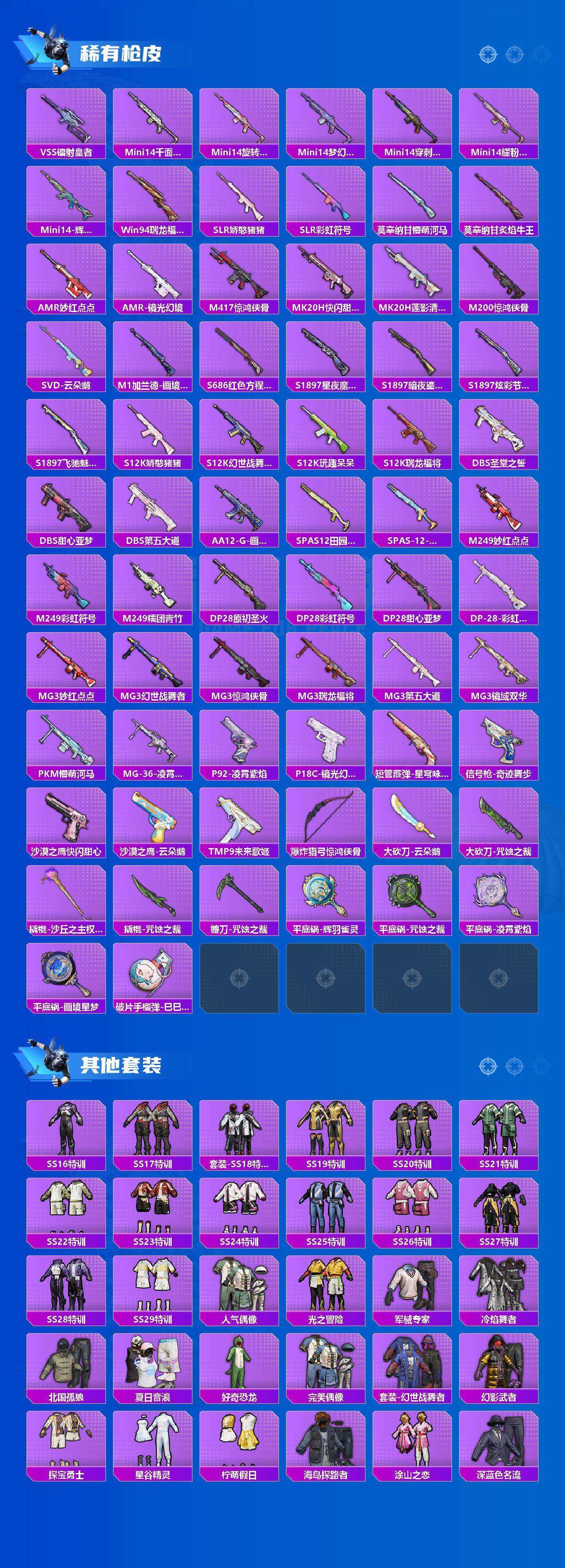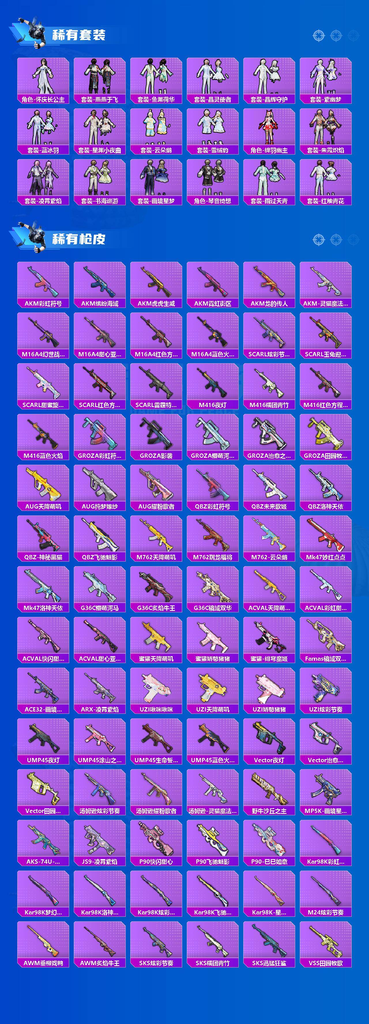 AKM-星际浪客,SCAR-L-梦幻火箭,GROZA-旋转彩虹,AUG-暖羊咩咩,UMP45-宇宙意志,Kar98K-巳巳如意,M24-镜域双华,MG3-洛神天依