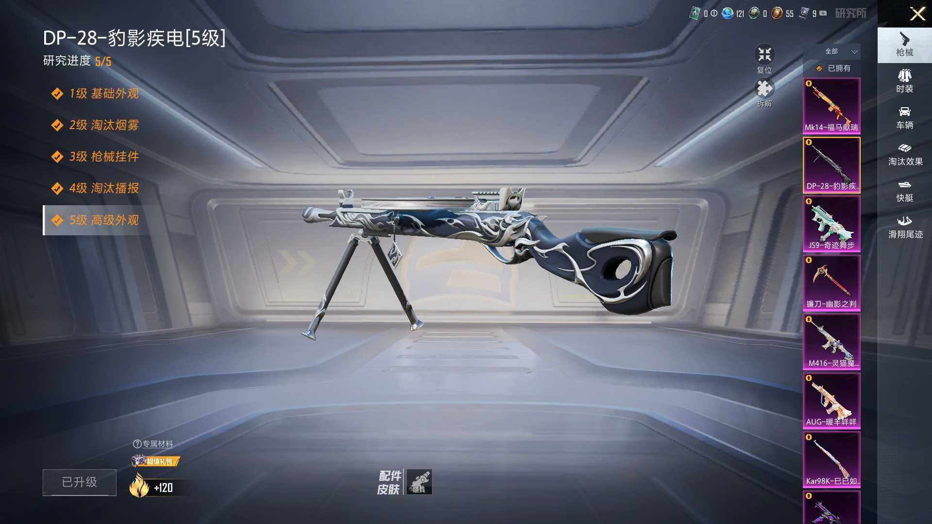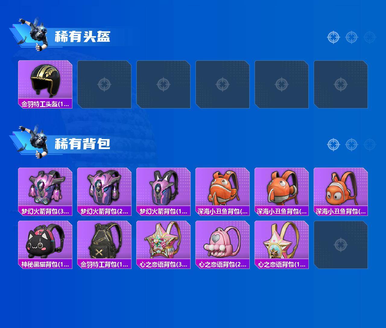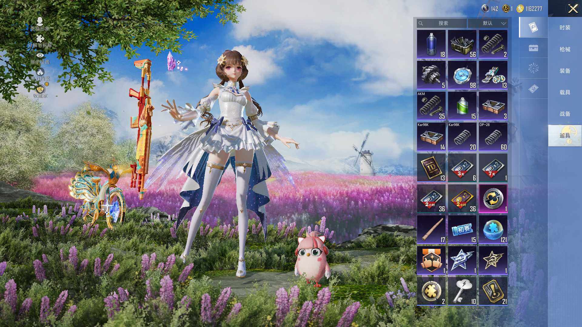 AKM-星际浪客,SCAR-L-梦幻火箭,GROZA-旋转彩虹,AUG-暖羊咩咩,UMP45-宇宙意志,Kar98K-巳巳如意,M24-镜域双华,MG3-洛神天依