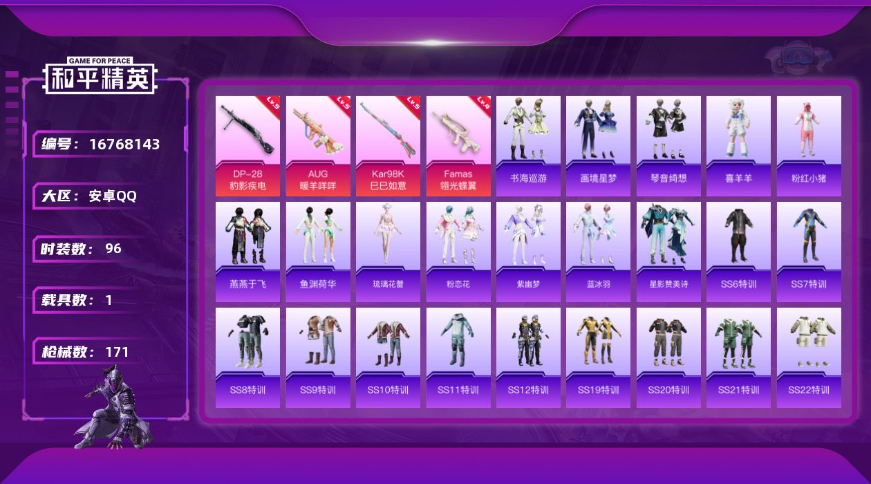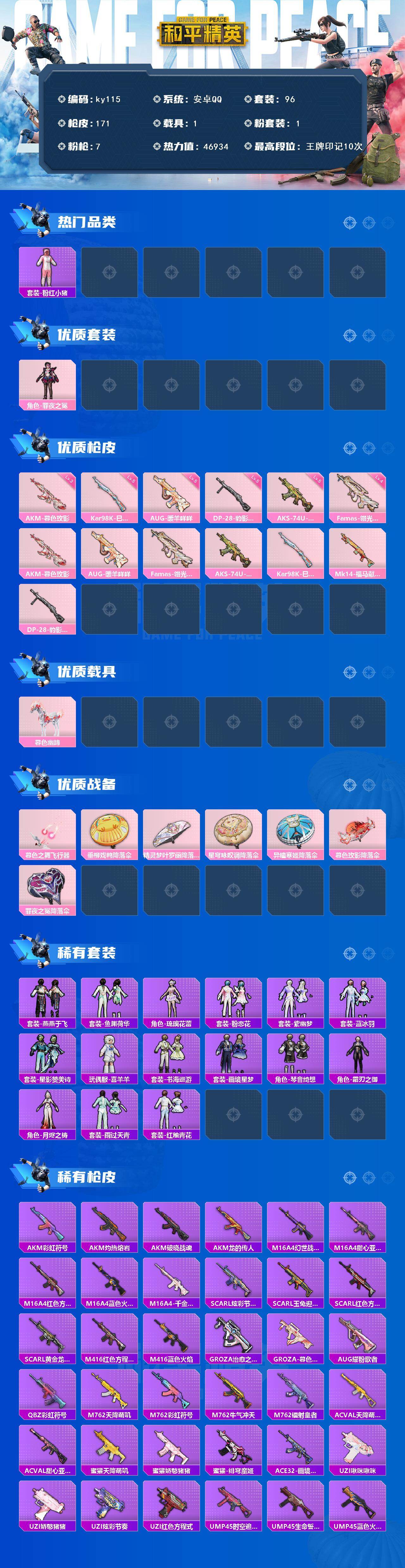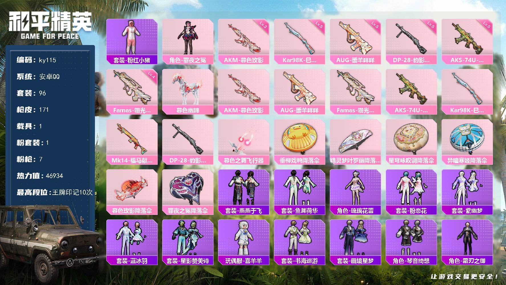 [16768143]安卓 手Q-1粉装-7特效枪-1载具-2粉色飞行器-46934热力值-10王牌印记-96套装-171枪皮