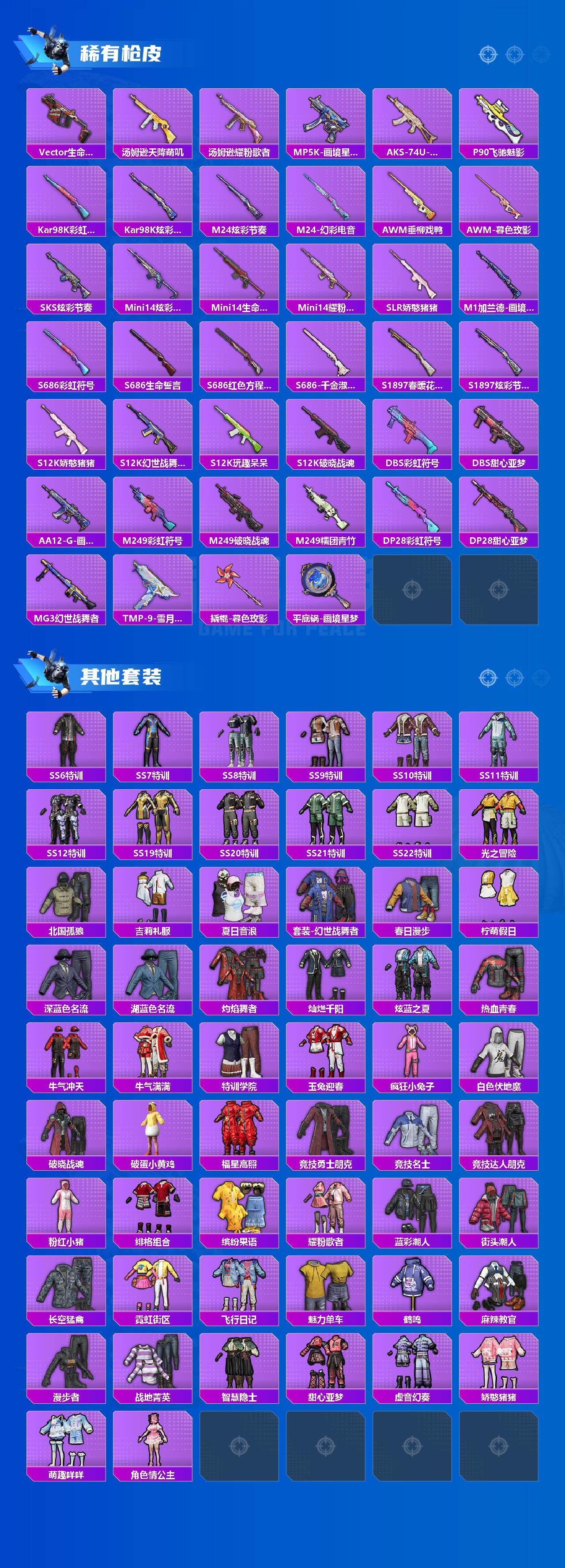 【稀有枪皮】:AKM-彩虹符号,AKM-灼热熔岩,AKM-破晓战魂,AKM-龙的传人,M16A4-幻世战舞者,M16A4-甜心亚梦,M16A4-红色方程式,M16A4-蓝色火焰,M16A4-千金淑猫,SCAR-L-炫彩节奏,SCAR-L-玉兔迎春,SCAR-L-红色方程式,SCAR-L-黄金龙骨,M416-红色方程式,M416-蓝色火焰,GROZA-治愈之星,GROZA-暮色玫影,AUG-耀粉歌者,QBZ-彩虹符号,M762-天降萌叽,M762-彩虹符号,M762-牛气冲天,M762-镭射皇者,AC-VAL-天降萌叽,AC-VAL-甜心亚梦,蜜獾-天降萌叽,蜜獾-娇憨猪猪,蜜獾-绯穹魔姬,ACE32-画境星梦,UZI-啾咪啾咪,UZI-娇憨猪猪,UZI-炫彩节奏,UZI-红色方程式,UMP45-时空追击者,UMP45-生命誓言,UMP45-蓝色火焰,Vector-生命誓言,汤姆逊-天降萌叽,汤姆逊-耀粉歌者,MP5K-画境星梦,AKS-74U-翎光蝶翼,P90-飞驰魅影,Kar98K-彩虹符号,Kar98K-炫彩节奏,M24-炫彩节奏,M24-幻彩电音,AWM-垂柳戏鸭,AWM-暮色玫影,SKS-炫彩节奏,Mini1