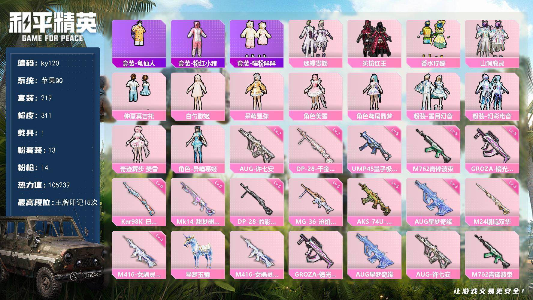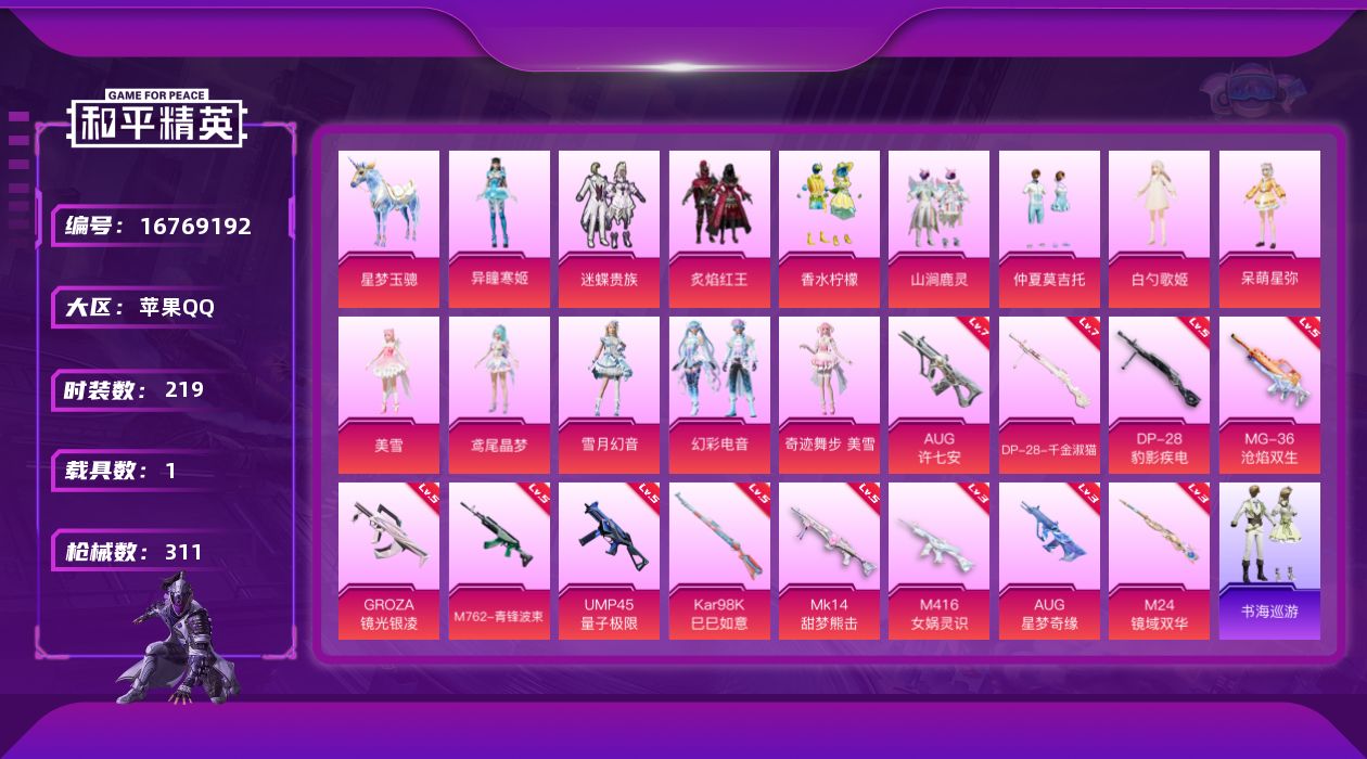 [16769192]苹果 手Q-13粉装-14特效枪-1载具-9粉色飞行器-105239热力值-15王牌印记-219套装-311枪皮