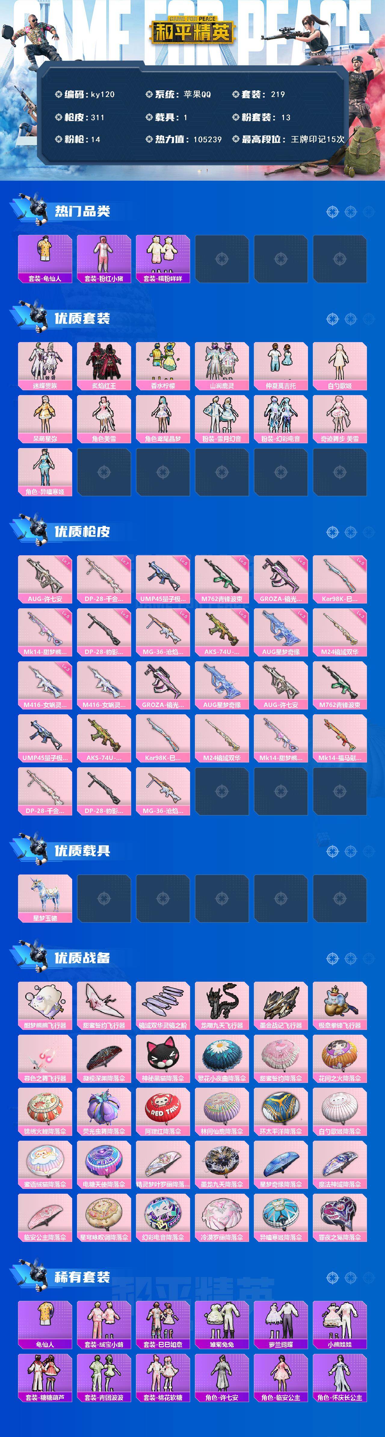 [16769192]苹果 手Q-13粉装-14特效枪-1载具-9粉色飞行器-105239热力值-15王牌印记-219套装-311枪皮 【热门品类】:套装-龟仙人,套装-粉红小猪,套装-糯粉咩咩 【粉色套装】:粉装-迷蝶贵族,粉装-炙焰红王,粉装-香水柠檬,粉装-山涧鹿灵,粉装-仲夏莫吉托,角色-白勺歌姬,角色-呆萌星弥,角色-美雪,角色-鸢尾晶梦,粉装-雪月幻音,粉装-幻彩电音,角色-奇迹舞步 美雪,角色-异瞳寒姬 【粉色枪皮等级】:M416-女娲灵识(三级),GROZA-镜光银凌(五级),AUG-星梦奇缘(三级),AUG-许七安(七级),M762-青锋波束(五级),UMP45-量子极限(五级),AKS-74U-森灵之息(五级),Kar98K-巳巳如意(五级),M24-镜域双华(三级),Mk14-甜梦熊击(五级),DP-28-千金淑猫(七级),DP-28-豹影疾电(五级),MG-36-沧焰双生(五级) 【粉色载具】:星梦玉骢 【粉色枪皮】:M416-女娲灵识,GROZA-镜光银凌,AUG-星梦奇缘,AUG-许七安,M762-青锋波束,UMP45-量子极限,AKS-74U-森灵之息,Kar98K-巳巳如意,M24-镜域双华,Mk14-甜梦熊击,Mk14-福马献瑞,DP-28-千金淑猫,DP-28-豹影疾电,MG-36-沧焰双生 【粉色飞行器】:酣梦熊熊飞行器,炫彩糖果飞行器,甜蜜誓约飞行器,镜域双华-灵镜之阶,龙翔九天飞行器,墨金战记飞行器,极意拳锋飞行器,暮色之舞飞行器 【粉色降落伞】:凝视深渊降落伞,神秘黑猫降落伞,繁花小夜曲降落伞,甜蜜誓约降落伞,花间之火降落伞,锦绣火鲤降落伞,荧光虫舞降落伞,阿狸红降落伞,林间仙鹿降落伞,环太平洋降落伞,白勺歌姬降落伞,蜜语绒猫降落伞,电糖天使降落伞,精灵梦叶罗丽降落伞,墨龙九天降落伞,星梦奇缘降落伞,魔法神域降落伞,临安公主降落伞,星穹咏叹调降落伞,幻彩电音降落伞,冷漠罗丽降落伞,异瞳寒姬降落伞,炫彩糖果降落伞,罪夜之冕降落伞 【稀有套装】:套装-龟仙人,套装-绒宝小鹅,套装-巳巳如意,套装-雪国风尚,套装-雏菊兔兔,套装-萝兰蝴蝶,套装-小熊娃娃,套装-糖糖葫芦,套装-青团波波,套装-棉花软糖,角色-许七安,角色-临安公主,角色-怀庆长公主,套装-燕燕于飞,套装-鱼渊荷华,套装-粉恋花,套装-紫幽梦,套装-蓝冰羽,角色-猎影月神,套装-霓虹