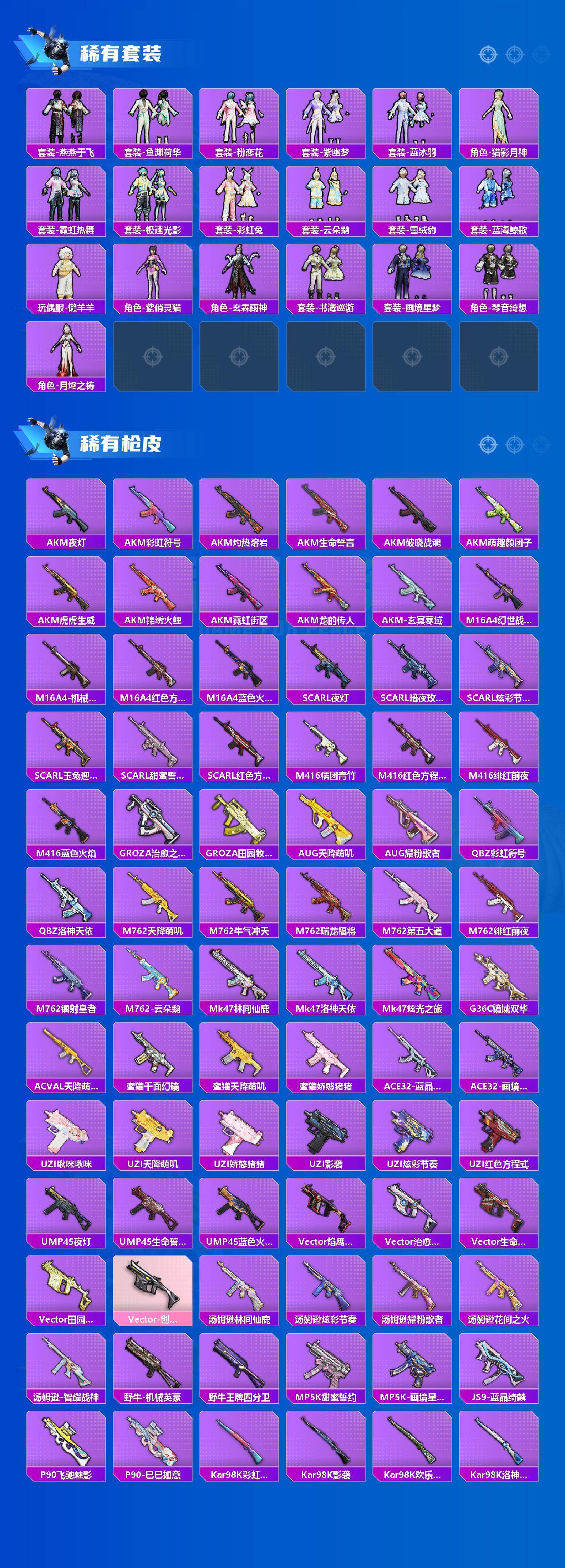 M416-女娲灵识,GROZA-镜光银凌,AUG-星梦奇缘,AUG-许七安,M762-青锋波束,UMP45-量子极限,Kar98K-巳巳如意,M24-镜域双华,DP-28-千金淑猫
