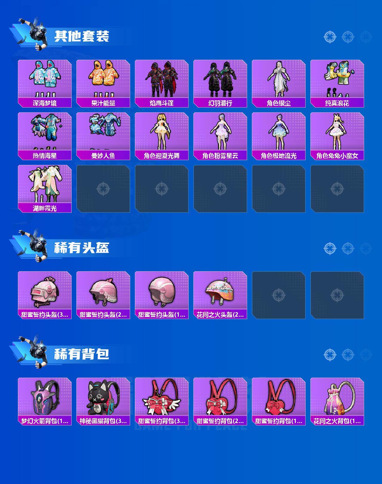 【稀有套装】:套装-龟仙人,套装-绒宝小鹅,套装-巳巳如意,套装-雪国风尚,套装-雏菊兔兔,套装-萝兰蝴蝶,套装-小熊娃娃,套装-糖糖葫芦,套装-青团波波,套装-棉花软糖,角色-许七安,角色-临安公主,角色-怀庆长公主,套装-燕燕于飞,套装-鱼渊荷华,套装-粉恋花,套装-紫幽梦,套装-蓝冰羽,角色-猎影月神,套装-霓虹
