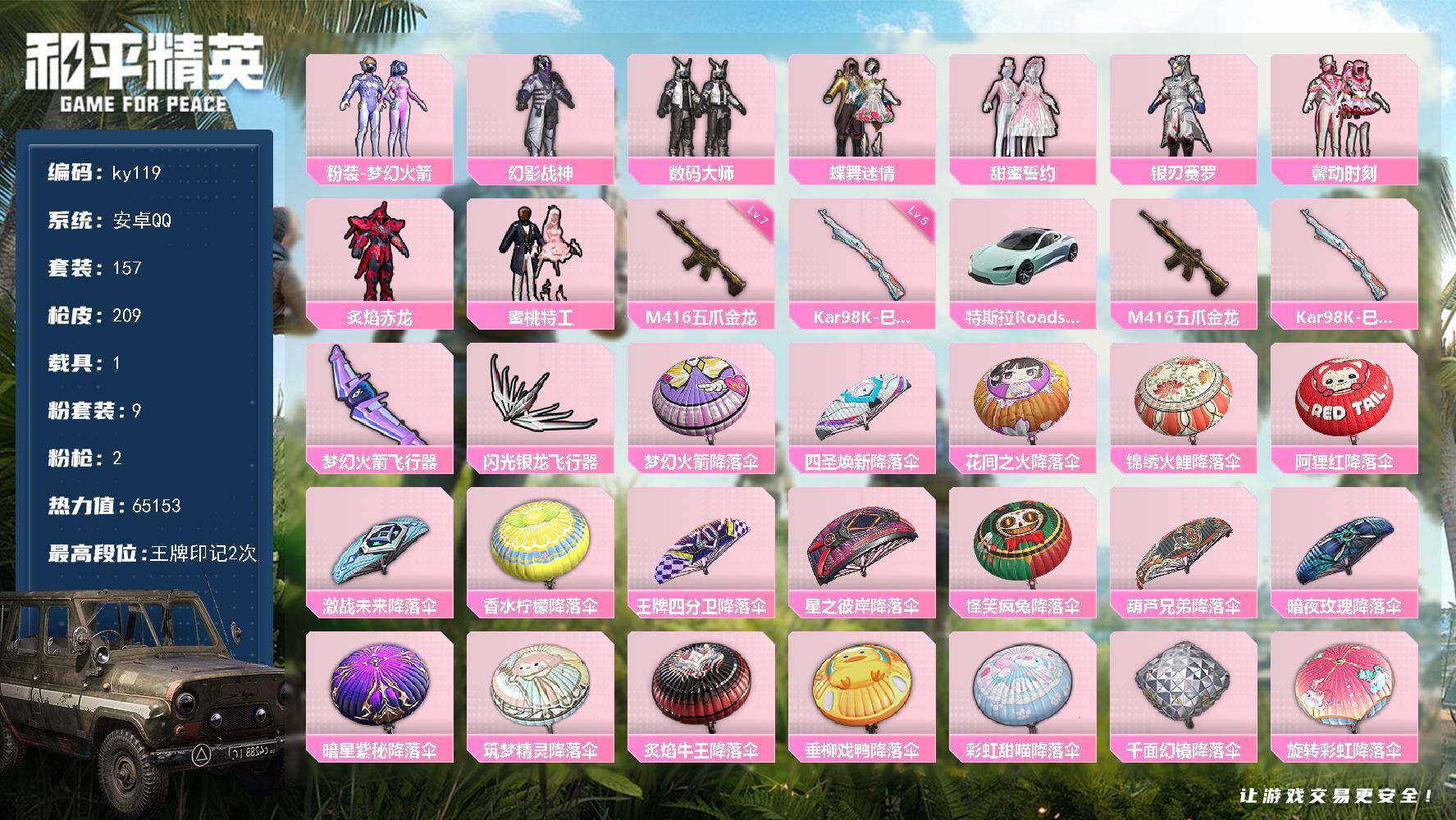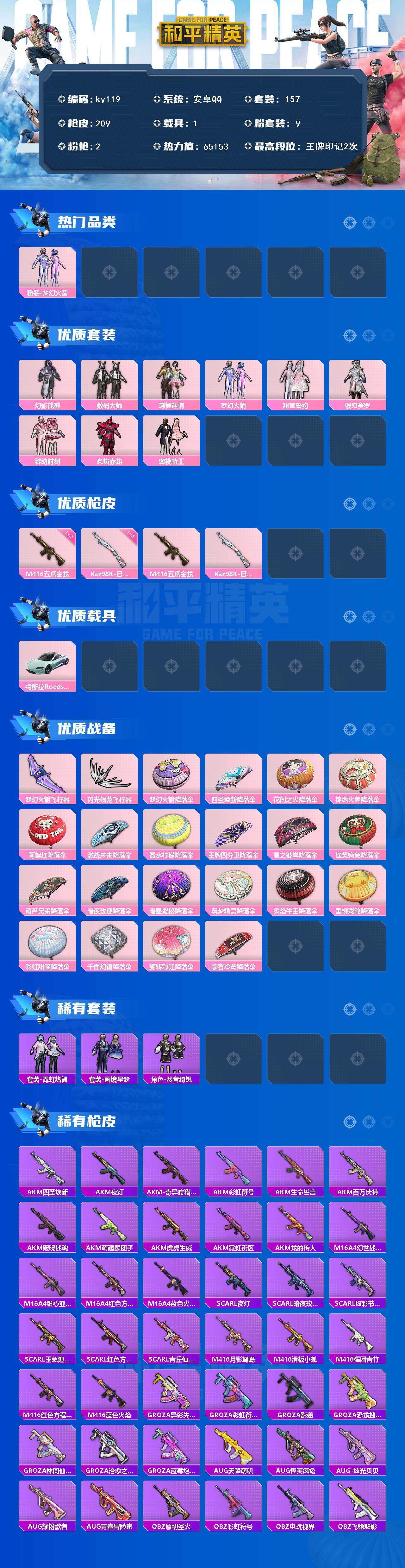 [16768940]安卓 手Q-9粉装-2特效枪-1载具-2粉色飞行器-65153热力值-2王牌印记-157套装-209枪皮 【热门品类】:粉装-梦幻火箭 【粉色套装】:粉装-幻影战神,粉装-数码大师,粉装-蝶舞迷情,粉装-梦幻火箭,粉装-甜蜜誓约,粉装-银刃赛罗,粉装-馨动时刻,粉装-炙焰赤龙,粉装-蜜桃特工 【粉色枪皮等级】:M416-五爪金龙(七级),Kar98K-巳巳如意(五级) 【粉色载具】:特斯拉Roadster(水滴蓝) 【粉色枪皮】:M416-五爪金龙,Kar98K-巳巳如意 【粉色飞行器】:梦幻火箭飞行器,闪光银龙飞行器 【粉色降落伞】:梦幻火箭降落伞,四圣焕新降落伞,花间之火降落伞,锦绣火鲤降落伞,阿狸红降落伞,激战未来降落伞,香水柠檬降落伞,王牌四分卫降落伞,星之彼岸降落伞,怪笑疯兔降落伞,葫芦兄弟降落伞,暗夜玫瑰降落伞,暗星紫秘降落伞,筑梦精灵降落伞,炙焰牛王降落伞,垂柳戏鸭降落伞,彩虹甜喵降落伞,千面幻镜降落伞,旋转彩虹降落伞,歌者泠鸢降落伞 【稀有套装】:套装-霓虹热舞,套装-画境星梦,套装-琴音绮想 【稀有枪皮】:AKM-四圣焕新,AKM-夜灯,AKM-奇异狩猎者,AKM-彩虹符号,AKM-生命誓言,AKM-百万伏特,AKM-破晓战魂,AKM-萌趣颜团子,AKM-虎虎生威,AKM-霓虹街区,AKM-龙的传人,M16A4-幻世战舞者,M16A4-甜心亚梦,M16A4-红色方程式,M16A4-蓝色火焰,SCAR-L-夜灯,SCAR-L-暗夜玫瑰,SCAR-L-炫彩节奏,SCAR-L-玉兔迎春,SCAR-L-红色方程式,SCAR-L-青丘仙客,M416-月影鸳鸯,M416-滑板小狐,M416-糯团青竹,M416-红色方程式,M416-蓝色火焰,GROZA-异彩先驱,GROZA-彩虹符号,GROZA-影袭,GROZA-恐龙拽拽,GROZA-林间仙鹿,GROZA-治愈之星,GROZA-蓝莓炮弹,AUG-天降萌叽,AUG-怪笑疯兔,AUG-炫光贝贝,AUG-耀粉歌者,AUG-青春冒险家,QBZ-原初圣火,QBZ-彩虹符号,QBZ-电玩视界,QBZ-飞驰魅影,M762-天降萌叽,M762-彩虹符号,M762-拳皇97,M762-牛气冲天,M762-瑞龙福将,M762-镭射皇者,Mk47-百万伏特,Mk47-青春冒险家,G36C-时空追击者,G36C-暗夜玫瑰,G36C