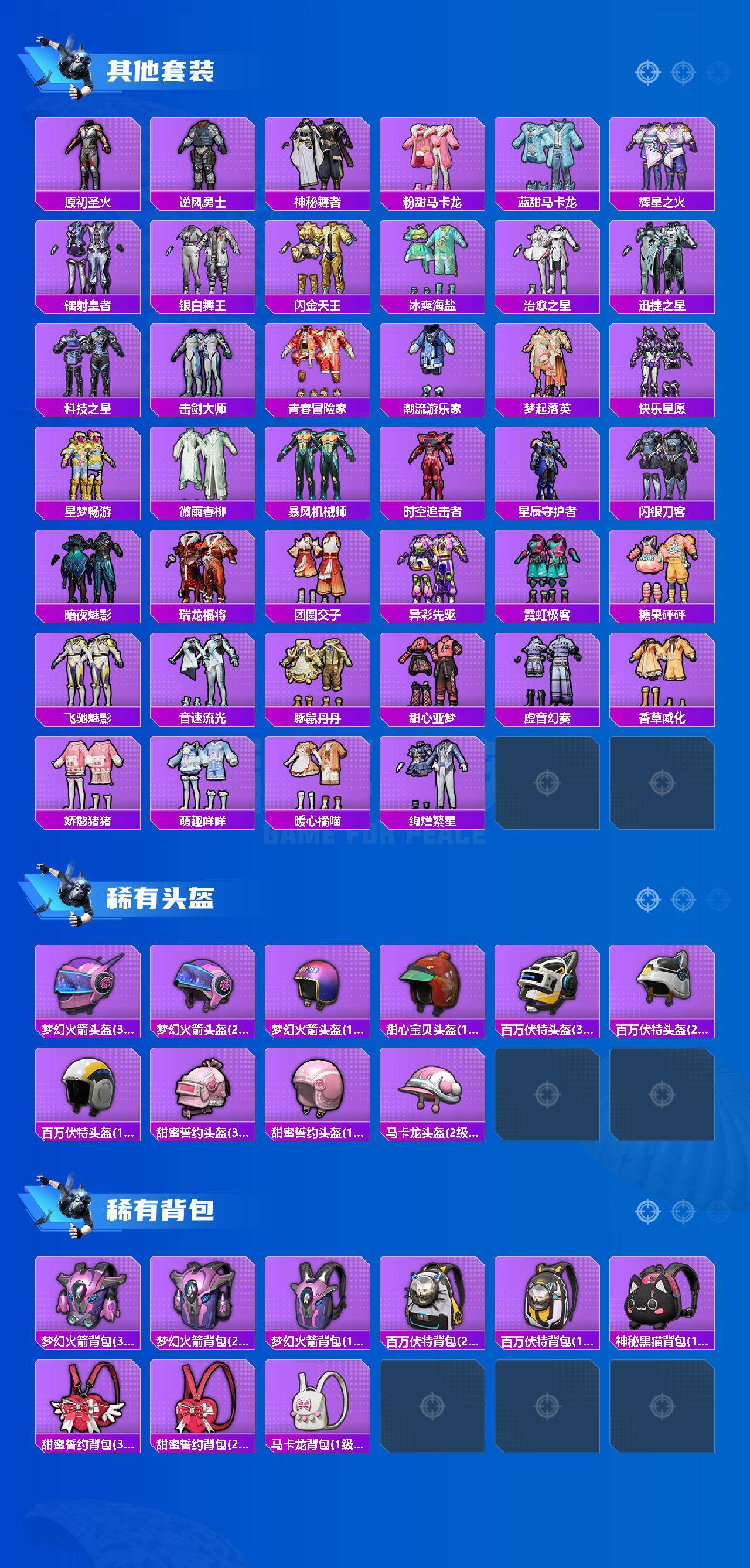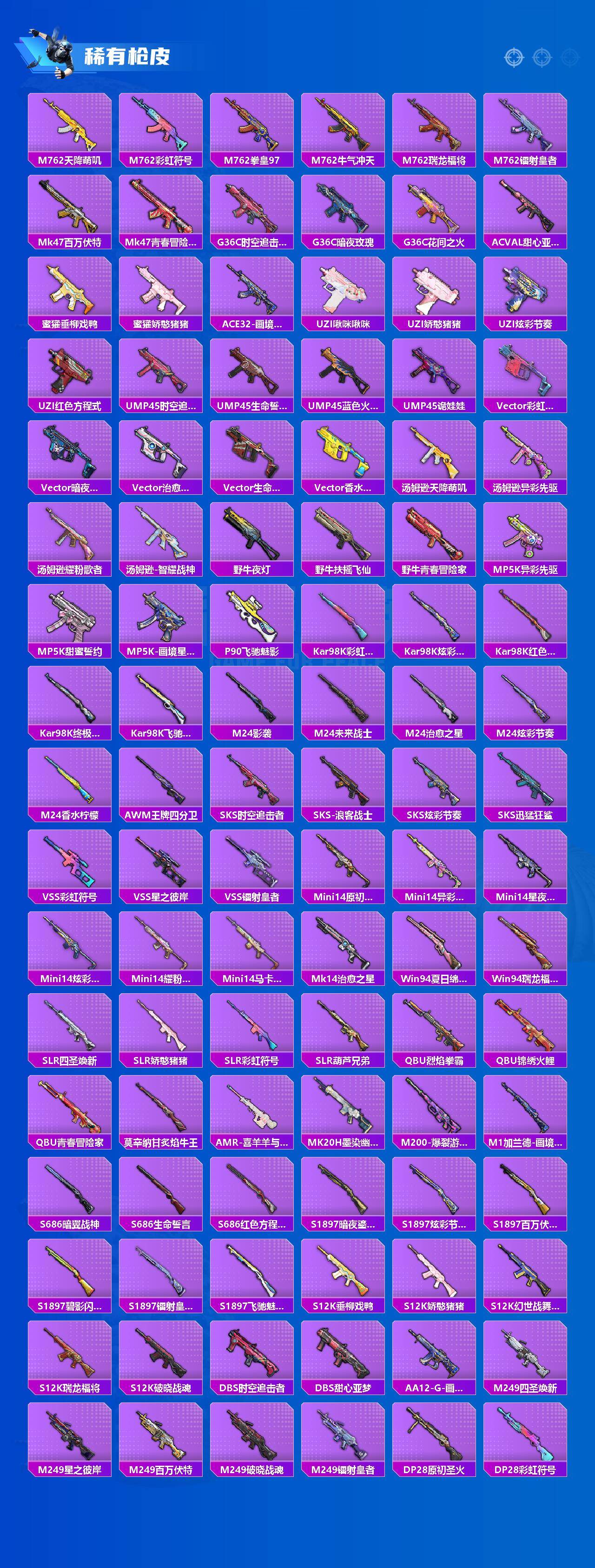【稀有枪皮】:AKM-四圣焕新,AKM-夜灯,AKM-奇异狩猎者,AKM-彩虹符号,AKM-生命誓言,AKM-百万伏特,AKM-破晓战魂,AKM-萌趣颜团子,AKM-虎虎生威,AKM-霓虹街区,AKM-龙的传人,M16A4-幻世战舞者,M16A4-甜心亚梦,M16A4-红色方程式,M16A4-蓝色火焰,SCAR-L-夜灯,SCAR-L-暗夜玫瑰,SCAR-L-炫彩节奏,SCAR-L-玉兔迎春,SCAR-L-红色方程式,SCAR-L-青丘仙客,M416-月影鸳鸯,M416-滑板小狐,M416-糯团青竹,M416-红色方程式,M416-蓝色火焰,GROZA-异彩先驱,GROZA-彩虹符号,GROZA-影袭,GROZA-恐龙拽拽,GROZA-林间仙鹿,GROZA-治愈之星,GROZA-蓝莓炮弹,AUG-天降萌叽,AUG-怪笑疯兔,AUG-炫光贝贝,AUG-耀粉歌者,AUG-青春冒险家,QBZ-原初圣火,QBZ-彩虹符号,QBZ-电玩视界,QBZ-飞驰魅影,M762-天降萌叽,M762-彩虹符号,M762-拳皇97,M762-牛气冲天,M762-瑞龙福将,M762-镭射皇者,Mk47-百万伏特,Mk47-青春冒险家,G36C-时空追击者,G36C-暗夜玫瑰,G36C