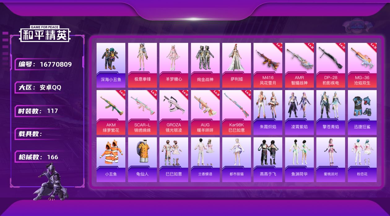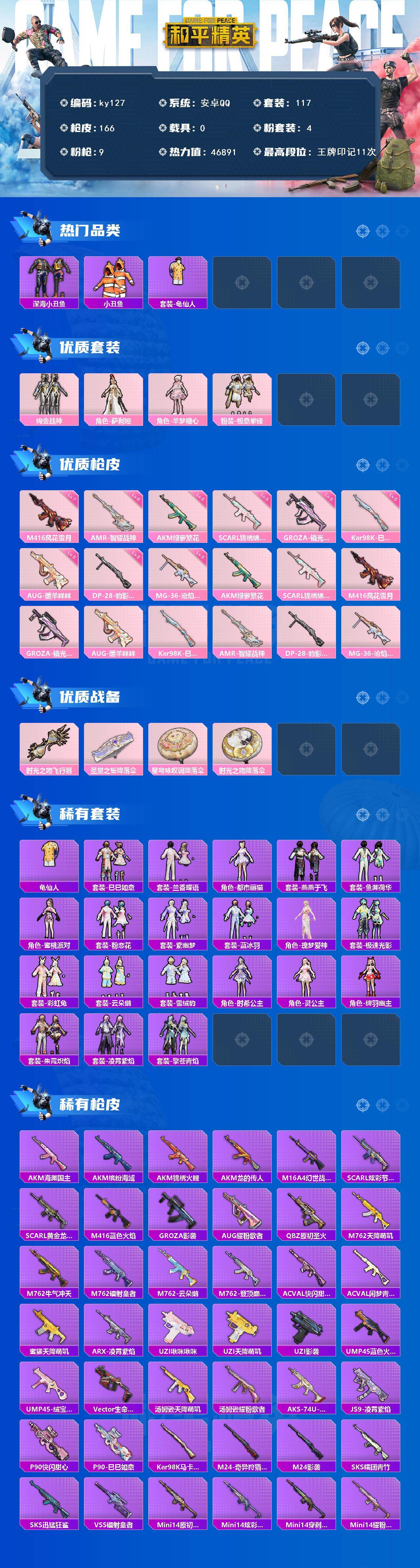 [16770809]安卓 手Q-4粉装-9特效枪-0载具-2粉色飞行器-46891热力值-11王牌印记-117套装-166枪皮 【热门品类】:套装-深海小丑鱼,套装-小丑鱼,套装-龟仙人 【粉色套装】:粉装-绚金战神,角色-萨利娅,角色-羊梦糖心,粉装-极意拳锋 【粉色枪皮等级】:AKM-绿萝繁花(五级),SCAR-L-锦绣绵绵(五级),M416-风花雪月(七级),GROZA-镜光银凌(五级),AUG-暖羊咩咩(五级),Kar98K-巳巳如意(五级),AMR-智耀战神(六级),DP-28-豹影疾电(五级),MG-36-沧焰双生(五级) 【粉色枪皮】:AKM-绿萝繁花,SCAR-L-锦绣绵绵,M416-风花雪月,GROZA-镜光银凌,AUG-暖羊咩咩,Kar98K-巳巳如意,AMR-智耀战神,DP-28-豹影疾电,MG-36-沧焰双生 【粉色飞行器】:炫彩糖果飞行器,时光之吻飞行器 【粉色降落伞】:圣堂之誓降落伞,星穹咏叹调降落伞,时光之吻降落伞,炫彩糖果降落伞 【稀有套装】:套装-龟仙人,套装-巳巳如意,套装-兰香蝶语,套装-雪国风尚,套装-炫彩糖果,角色-都市丽猫,套装-燕燕于飞,套装-鱼渊荷华,角色-蜜桃派对,套装-粉恋花,套装-紫幽梦,套装-蓝冰羽,角色-瑰梦爱神,套装-极速光影,套装-彩虹兔,套装-云朵鹅,套装-雪绒豹,角色-时希公主,角色-灵公主,角色-绛羽幽主,套装-朱霞炽焰,套装-凌霄紫焰,套装-擎苍青焰 【稀有枪皮】:AKM-海渊国主,AKM-缤纷海域,AKM-锦绣火鲤,AKM-龙的传人,M16A4-幻世战舞者,SCAR-L-炫彩节奏,SCAR-L-黄金龙骨,M416-蓝色火焰,GROZA-影袭,AUG-耀粉歌者,QBZ-原初圣火,M762-天降萌叽,M762-牛气冲天,M762-镭射皇者,M762-云朵鹅,M762-登顶巅峰,AC-VAL-快闪甜心,AC-VAL-闲梦青缨,蜜獾-天降萌叽,ARX-凌霄紫焰,UZI-啾咪啾咪,UZI-天降萌叽,UZI-影袭,UMP45-蓝色火焰,UMP45-绒宝小鹅,Vector-生命誓言,汤姆逊-天降萌叽,汤姆逊-耀粉歌者,AKS-74U-鬼刀,JS9-凌霄紫焰,P90-快闪甜心,P90-巳巳如意,Kar98K-马卡龙,M24-影袭,M24-奇异狩猎者,SKS-糯团青竹,SKS-迅猛狂鲨,VSS-镭射皇者,Mini14-原初圣火,M