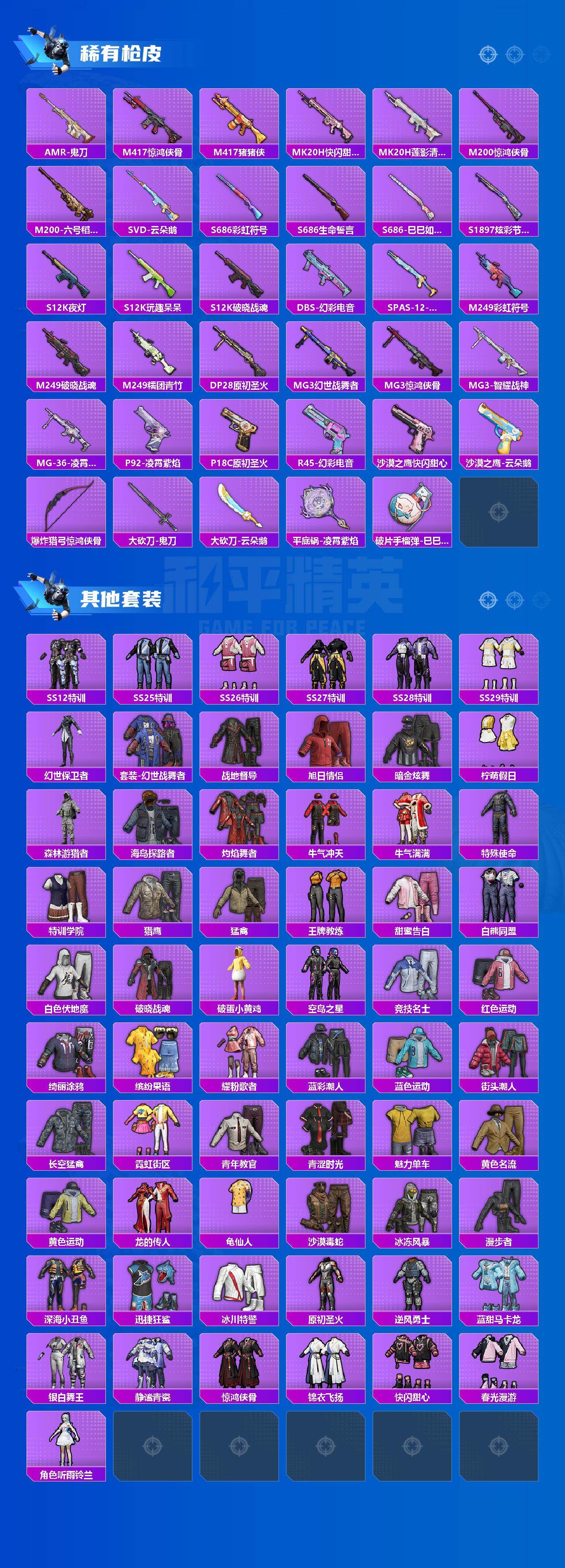 【稀有枪皮】:AKM-海渊国主,AKM-缤纷海域,AKM-锦绣火鲤,AKM-龙的传人,M16A4-幻世战舞者,SCAR-L-炫彩节奏,SCAR-L-黄金龙骨,M416-蓝色火焰,GROZA-影袭,AUG-耀粉歌者,QBZ-原初圣火,M762-天降萌叽,M762-牛气冲天,M762-镭射皇者,M762-云朵鹅,M762-登顶巅峰,AC-VAL-快闪甜心,AC-VAL-闲梦青缨,蜜獾-天降萌叽,ARX-凌霄紫焰,UZI-啾咪啾咪,UZI-天降萌叽,UZI-影袭,UMP45-蓝色火焰,UMP45-绒宝小鹅,Vector-生命誓言,汤姆逊-天降萌叽,汤姆逊-耀粉歌者,AKS-74U-鬼刀,JS9-凌霄紫焰,P90-快闪甜心,P90-巳巳如意,Kar98K-马卡龙,M24-影袭,M24-奇异狩猎者,SKS-糯团青竹,SKS-迅猛狂鲨,VSS-镭射皇者,Mini14-原初圣火,M