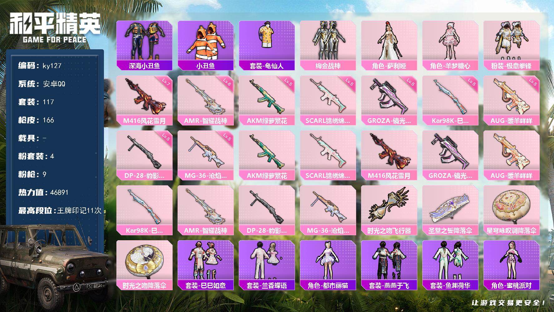 [16770809]安卓 手Q-4粉装-9特效枪-0载具-2粉色飞行器-46891热力值-11王牌印记-117套装-166枪皮