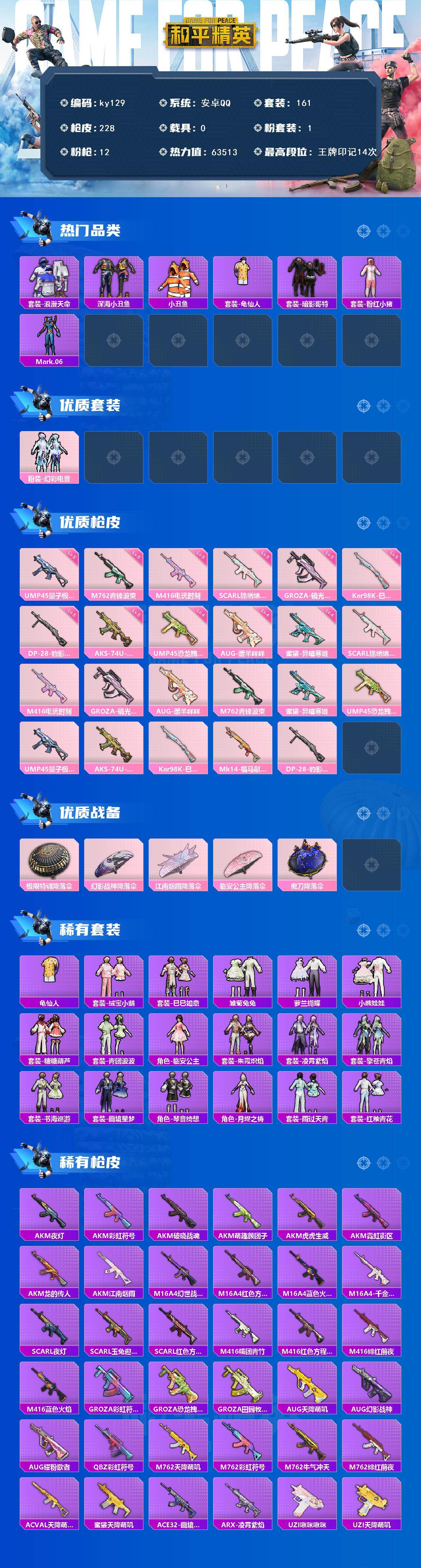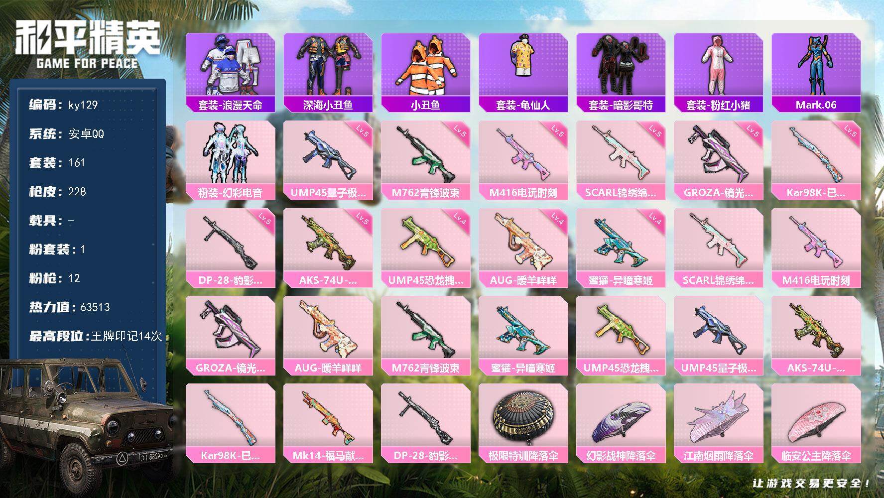 [16771119]安卓 手Q-1粉装-12特效枪-0载具-2粉色飞行器-63513热力值-14王牌印记-161套装-228枪皮 【热门品类】:套装-浪漫天命,套装-深海小丑鱼,套装-小丑鱼,套装-龟仙人,套装-暗影哥特,套装-粉红小猪,角色-Mark.06 【粉色套装】:粉装-幻彩电音 【粉色枪皮等级】:SCAR-L-锦绣绵绵(五级),M416-电玩时刻(五级),GROZA-镜光银凌(五级),AUG-暖羊咩咩(四级),M762-青锋波束(五级),蜜獾-异瞳寒姬(四级),UMP45-恐龙拽拽(四级),UMP45-量子极限(五级),AKS-74U-森灵之息(五级),Kar98K-巳巳如意(五级),DP-28-豹影疾电(五级) 【粉色枪皮】:SCAR-L-锦绣绵绵,M416-电玩时刻,GROZA-镜光银凌,AUG-暖羊咩咩,M762-青锋波束,蜜獾-异瞳寒姬,UMP45-恐龙拽拽,UMP45-量子极限,AKS-74U-森灵之息,Kar98K-巳巳如意,Mk14-福马献瑞,DP-28-豹影疾电 【粉色飞行器】:炫彩糖果飞行器 【粉色降落伞】:极限特训降落伞,幻影战神降落伞,江南烟雨降落伞,临安公主降落伞,鬼刀降落伞,炫彩糖果降落伞 【稀有套装】:套装-龟仙人,套装-绒宝小鹅,套装-巳巳如意,套装-雪国风尚,套装-炫彩糖果,套装-雏菊兔兔,套装-萝兰蝴蝶,套装-小熊娃娃,套装-糖糖葫芦,套装-青团波波,角色-临安公主,套装-朱霞炽焰,套装-凌霄紫焰,套装-擎苍青焰,套装-书海巡游,套装-画境星梦,套装-琴音绮想,角色-月烬之祷,套装-雨过天青,套装-红釉青花 【稀有枪皮】:AUG-冰晶雪宝,AKM-夜灯,AKM-彩虹符号,AKM-江南烟雨,AKM-破晓战魂,AKM-萌趣颜团子,AKM-虎虎生威,AKM-霓虹街区,AKM-龙的传人,M16A4-幻世战舞者,M16A4-红色方程式,M16A4-蓝色火焰,M16A4-千金淑猫,SCAR-L-夜灯,SCAR-L-玉兔迎春,SCAR-L-红色方程式,M416-糯团青竹,M416-红色方程式,M416-绯红前夜,M416-蓝色火焰,GROZA-彩虹符号,GROZA-恐龙拽拽,GROZA-田园牧歌,AUG-天降萌叽,AUG-幻影战神,AUG-耀粉歌者,QBZ-彩虹符号,M762-天降萌叽,M762-彩虹符号,M762-牛气冲天,M762-绯红前夜,AC-V