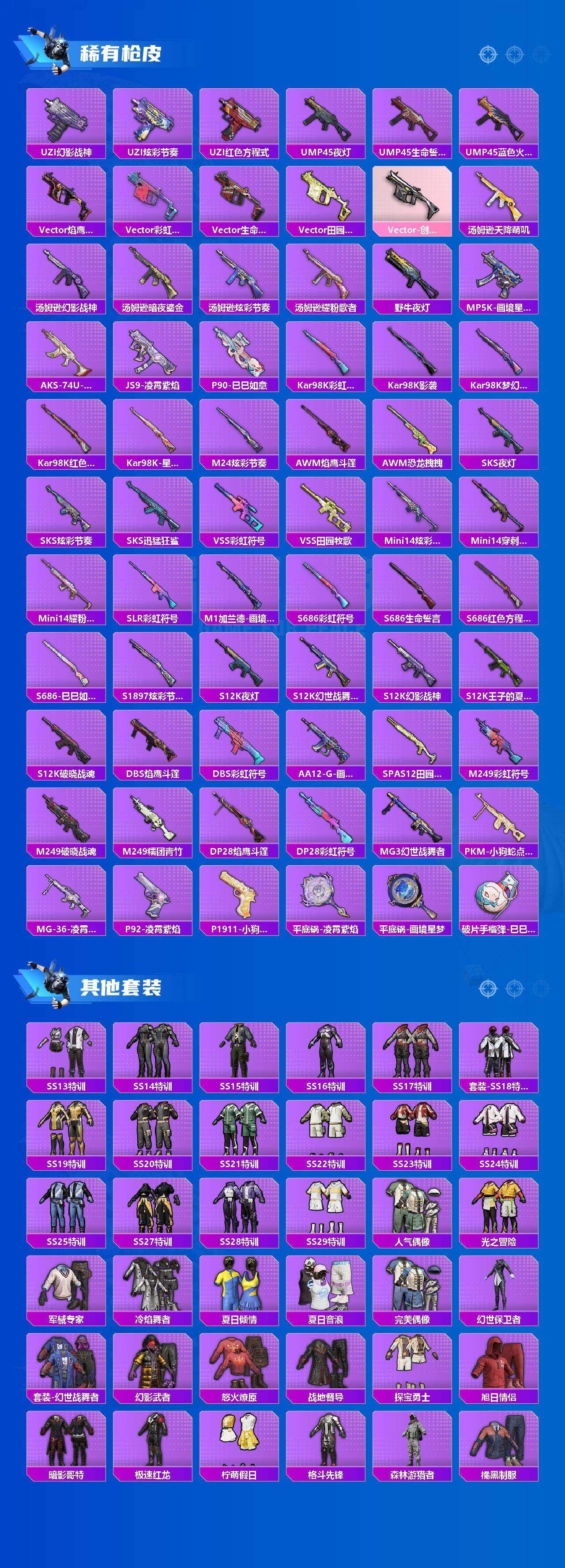 【稀有枪皮】:AUG-冰晶雪宝,AKM-夜灯,AKM-彩虹符号,AKM-江南烟雨,AKM-破晓战魂,AKM-萌趣颜团子,AKM-虎虎生威,AKM-霓虹街区,AKM-龙的传人,M16A4-幻世战舞者,M16A4-红色方程式,M16A4-蓝色火焰,M16A4-千金淑猫,SCAR-L-夜灯,SCAR-L-玉兔迎春,SCAR-L-红色方程式,M416-糯团青竹,M416-红色方程式,M416-绯红前夜,M416-蓝色火焰,GROZA-彩虹符号,GROZA-恐龙拽拽,GROZA-田园牧歌,AUG-天降萌叽,AUG-幻影战神,AUG-耀粉歌者,QBZ-彩虹符号,M762-天降萌叽,M762-彩虹符号,M762-牛气冲天,M762-绯红前夜,AC-V