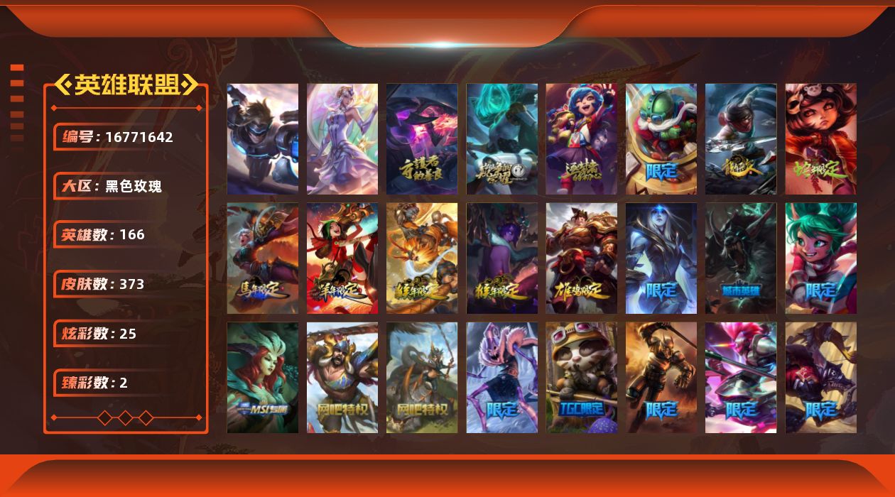 [16771642]白银段位-166英雄-373皮肤-25炫彩-2终极-3神话-76限定-46传说-90史诗
