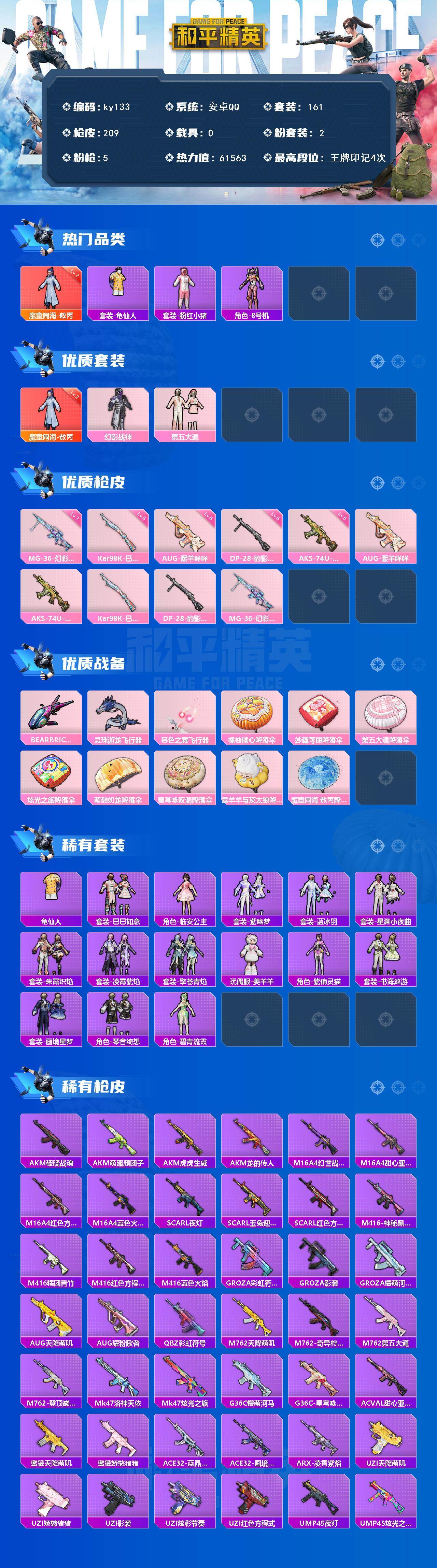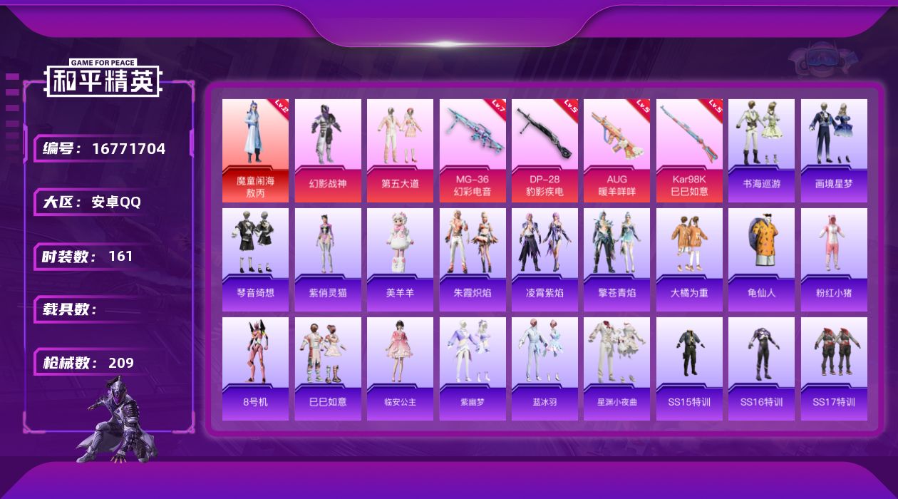 [16771704]安卓 手Q-1神装-2粉装-5特效枪-0载具-4粉色飞行器-61563热力值-4王牌印记-161套装-209枪皮 【红色神装等级】:魔童闹海-敖丙(二级) 【红色角色神装】:魔童闹海-敖丙 【热门品类】:套装-龟仙人,套装-粉红小猪,角色-8号机 【粉色套装】:粉装-幻影战神,粉装-第五大道 【粉色枪皮等级】:AUG-暖羊咩咩(五级),AKS-74U-森灵之息(五级),Kar98K-巳巳如意(五级),DP-28-豹影疾电(五级),MG-36-幻彩电音(七级) 【粉色枪皮】:AUG-暖羊咩咩,AKS-74U-森灵之息,Kar98K-巳巳如意,DP-28-豹影疾电,MG-36-幻彩电音 【粉色飞行器】:炫彩糖果飞行器,BEARBRICK飞行器,灵珠游龙飞行器,暮色之舞飞行器 【粉色降落伞】:橘柚倾心降落伞,妙趣可丽降落伞,第五大道降落伞,炫光之旅降落伞,萌酷奶龙降落伞,星穹咏叹调降落伞,喜羊羊与灰太狼降落伞,魔童闹海 敖丙降落伞,炫彩糖果降落伞 【稀有套装】:套装-龟仙人,套装-巳巳如意,套装-雪国风尚,套装-炫彩糖果,角色-临安公主,套装-紫幽梦,套装-蓝冰羽,套装-星渊小夜曲,套装-朱霞炽焰,套装-凌霄紫焰,套装-擎苍青焰,玩偶服-美羊羊,角色-紫俏灵猫,套装-书海巡游,套装-画境星梦,套装-琴音绮想,角色-碧青流霞 【稀有枪皮】:AUG-冰晶雪宝,AKM-破晓战魂,AKM-萌趣颜团子,AKM-虎虎生威,AKM-龙的传人,M16A4-幻世战舞者,M16A4-甜心亚梦,M16A4-红色方程式,M16A4-蓝色火焰,SCAR-L-夜灯,SCAR-L-玉兔迎春,SCAR-L-红色方程式,M416-神秘黑猫,M416-糯团青竹,M416-红色方程式,M416-蓝色火焰,GROZA-彩虹符号,GROZA-影袭,GROZA-懵萌河马,AUG-天降萌叽,AUG-耀粉歌者,QBZ-彩虹符号,M762-天降萌叽,M762-奇异狩猎者,M762-第五大道,M762-登顶巅峰,Mk47-洛神天依,Mk47-炫光之旅,G36C-懵萌河马,G36C-星穹咏叹调,AC-VAL-甜心亚梦,蜜獾-天降萌叽,蜜獾-娇憨猪猪,ACE32-蓝晶绮麟,ACE32-画境星梦,ARX-凌霄紫焰,UZI-天降萌叽,UZI-娇憨猪猪,UZI-影袭,UZI-炫彩节奏,UZI-红色方程式,UMP45-夜灯,UMP4