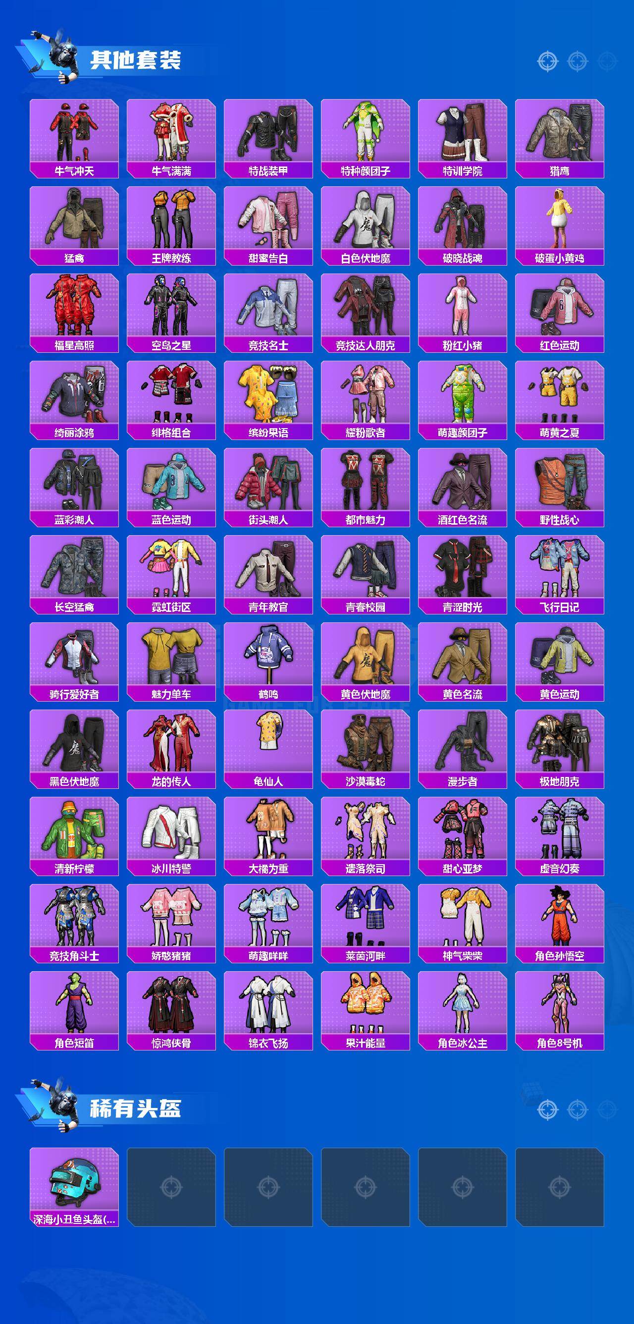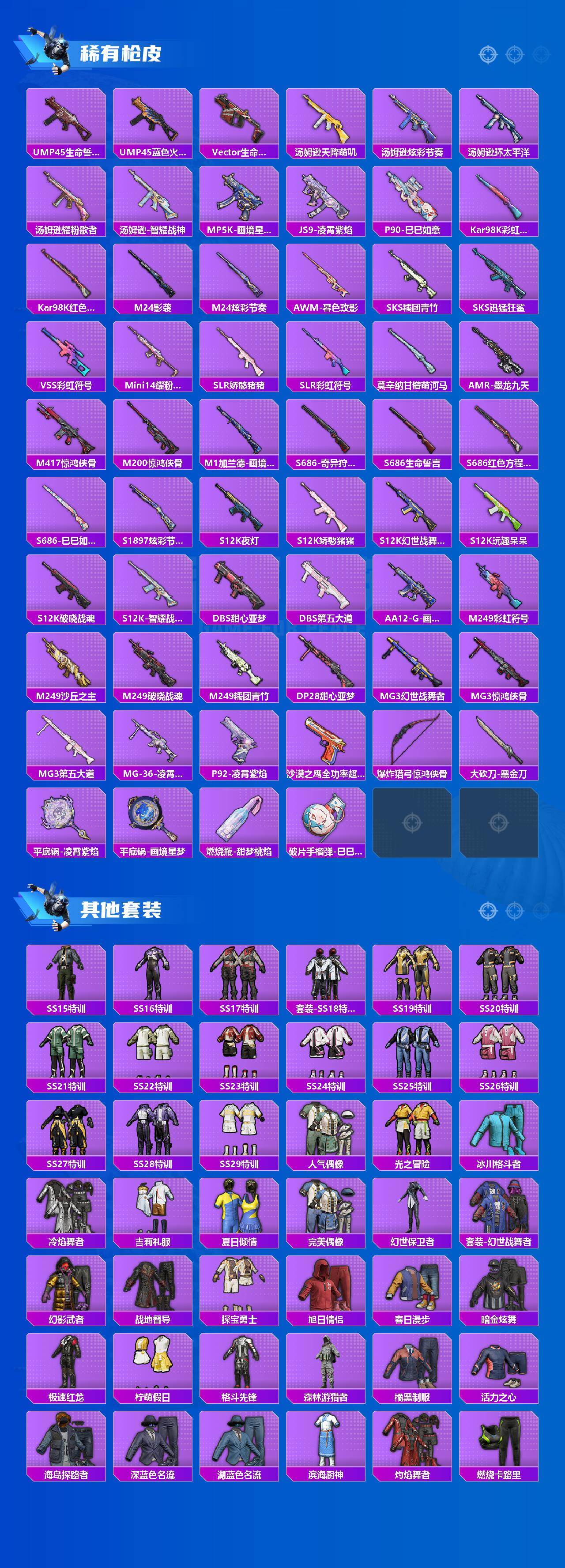 【稀有枪皮】:AUG-冰晶雪宝,AKM-破晓战魂,AKM-萌趣颜团子,AKM-虎虎生威,AKM-龙的传人,M16A4-幻世战舞者,M16A4-甜心亚梦,M16A4-红色方程式,M16A4-蓝色火焰,SCAR-L-夜灯,SCAR-L-玉兔迎春,SCAR-L-红色方程式,M416-神秘黑猫,M416-糯团青竹,M416-红色方程式,M416-蓝色火焰,GROZA-彩虹符号,GROZA-影袭,GROZA-懵萌河马,AUG-天降萌叽,AUG-耀粉歌者,QBZ-彩虹符号,M762-天降萌叽,M762-奇异狩猎者,M762-第五大道,M762-登顶巅峰,Mk47-洛神天依,Mk47-炫光之旅,G36C-懵萌河马,G36C-星穹咏叹调,AC-VAL-甜心亚梦,蜜獾-天降萌叽,蜜獾-娇憨猪猪,ACE32-蓝晶绮麟,ACE32-画境星梦,ARX-凌霄紫焰,UZI-天降萌叽,UZI-娇憨猪猪,UZI-影袭,UZI-炫彩节奏,UZI-红色方程式,UMP45-夜灯,UMP4