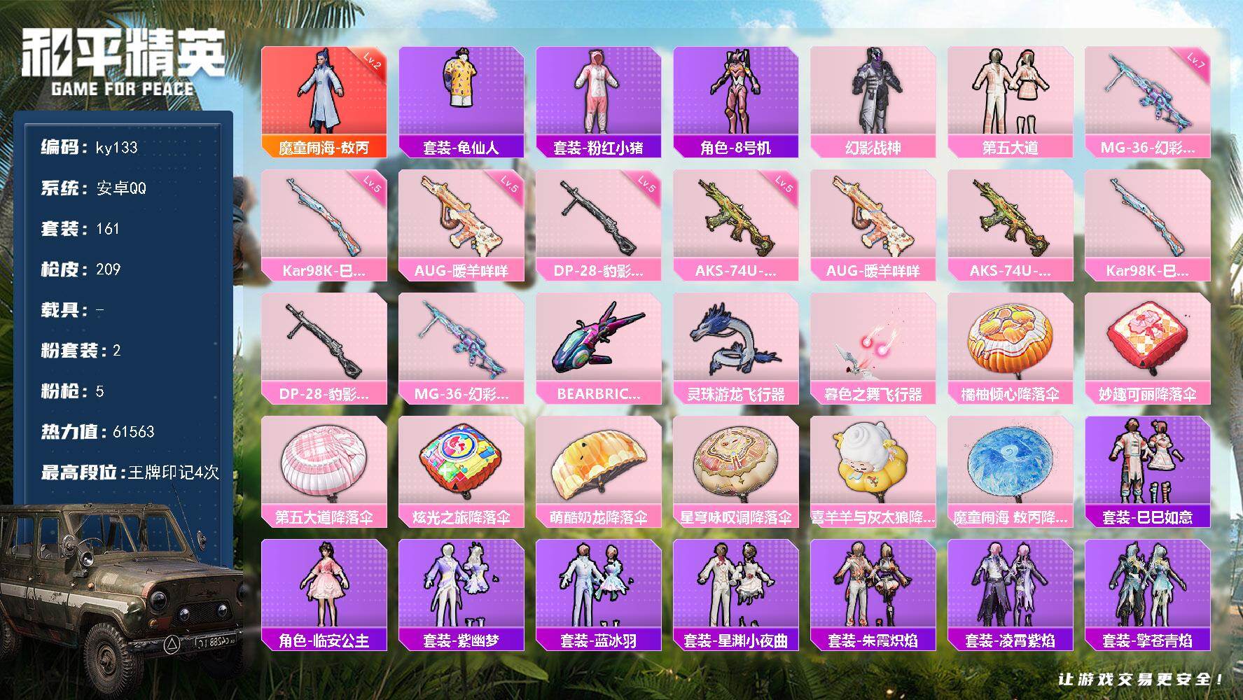 [16771704]安卓 手Q-1神装-2粉装-5特效枪-0载具-4粉色飞行器-61563热力值-4王牌印记-161套装-209枪皮