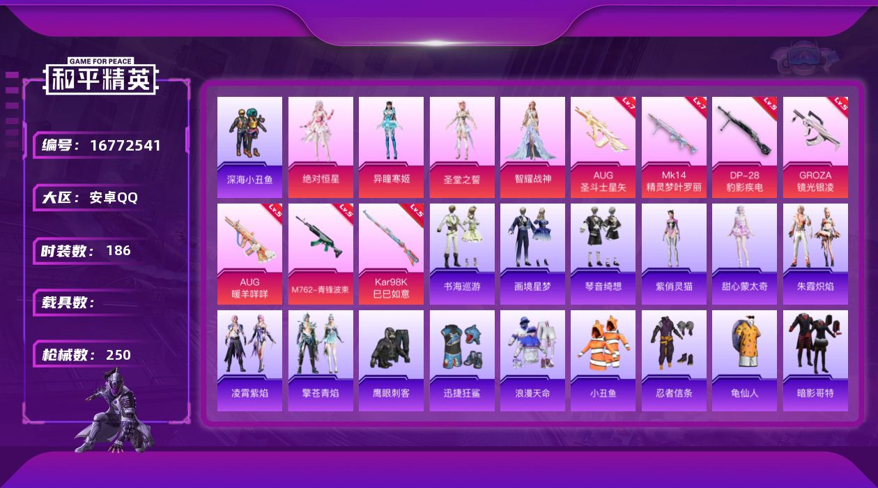 [16772541]安卓 手Q-4粉装-9特效枪-0载具-2粉色飞行器-69834热力值-12王牌印记-186套装-250枪皮