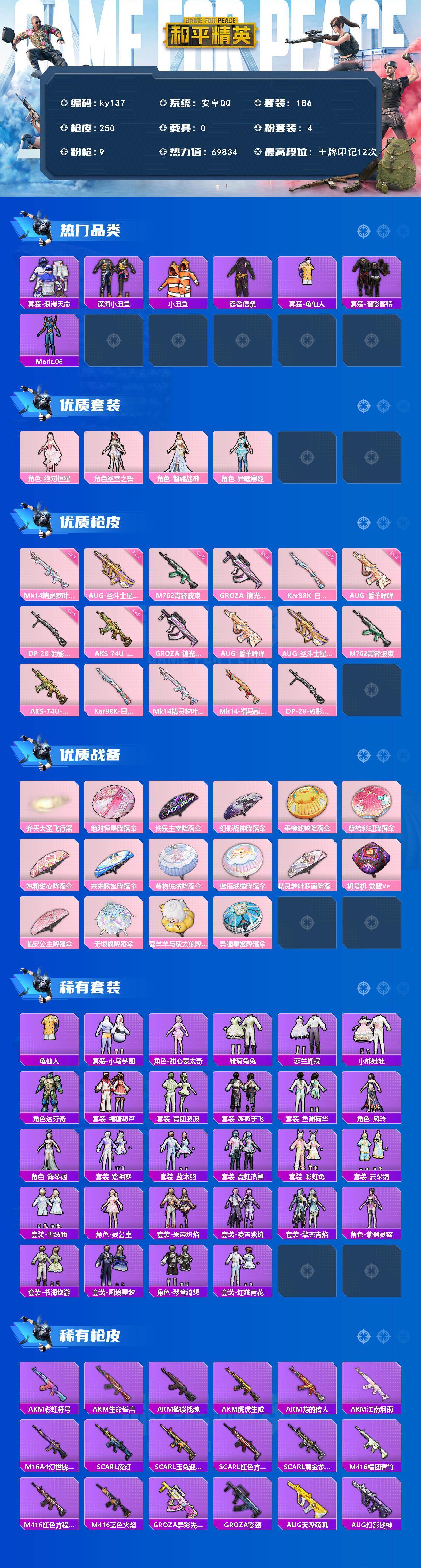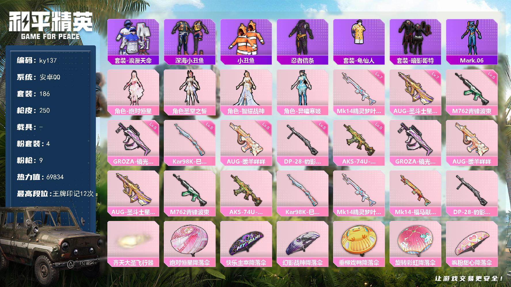 [16772541]安卓 手Q-4粉装-9特效枪-0载具-2粉色飞行器-69834热力值-12王牌印记-186套装-250枪皮 【热门品类】:套装-浪漫天命,套装-深海小丑鱼,套装-小丑鱼,套装-忍者信条,套装-龟仙人,套装-暗影哥特,角色-Mark.06 【粉色套装】:角色-绝对恒星,角色-圣堂之誓,角色-智耀战神,角色-异瞳寒姬 【粉色枪皮等级】:GROZA-镜光银凌(五级),AUG-暖羊咩咩(五级),AUG-圣斗士星矢(七级),M762-青锋波束(五级),AKS-74U-森灵之息(五级),Kar98K-巳巳如意(五级),Mk14-精灵梦叶罗丽(七级),DP-28-豹影疾电(五级) 【粉色枪皮】:GROZA-镜光银凌,AUG-暖羊咩咩,AUG-圣斗士星矢,M762-青锋波束,AKS-74U-森灵之息,Kar98K-巳巳如意,Mk14-精灵梦叶罗丽,Mk14-福马献瑞,DP-28-豹影疾电 【粉色飞行器】:炫彩糖果飞行器,齐天大圣飞行器 【粉色降落伞】:绝对恒星降落伞,快乐主宰降落伞,幻影战神降落伞,垂柳戏鸭降落伞,旋转彩虹降落伞,飒粉甜心降落伞,未来歌姬降落伞,萌物绒绒降落伞,蜜语绒猫降落伞,精灵梦叶罗丽降落伞,初号机 觉醒Ver.降落伞,临安公主降落伞,无垠阁降落伞,喜羊羊与灰太狼降落伞,异瞳寒姬降落伞,炫彩糖果降落伞 【稀有套装】:套装-龟仙人,套装-小鸟芋圆,角色-甜心蒙太奇,套装-雪国风尚,套装-炫彩糖果,套装-雏菊兔兔,套装-萝兰蝴蝶,套装-小熊娃娃,角色-达芬奇,套装-糖糖葫芦,套装-青团波波,套装-燕燕于飞,套装-鱼渊荷华,角色-风玲,角色-海琴烟,套装-紫幽梦,套装-蓝冰羽,套装-霓虹热舞,套装-彩虹兔,套装-云朵鹅,套装-雪绒豹,角色-灵公主,套装-朱霞炽焰,套装-凌霄紫焰,套装-擎苍青焰,角色-紫俏灵猫,套装-书海巡游,套装-画境星梦,套装-琴音绮想,套装-红釉青花 【稀有枪皮】:AUG-冰晶雪宝,AKM-彩虹符号,AKM-江南烟雨,AKM-生命誓言,AKM-破晓战魂,AKM-虎虎生威,AKM-龙的传人,M16A4-幻世战舞者,SCAR-L-夜灯,SCAR-L-玉兔迎春,SCAR-L-红色方程式,SCAR-L-黄金龙骨,M416-糯团青竹,M416-红色方程式,M416-蓝色火焰,GROZA-异彩先驱,GROZA-影袭,AUG-天降萌叽,AUG-幻影战神,AU