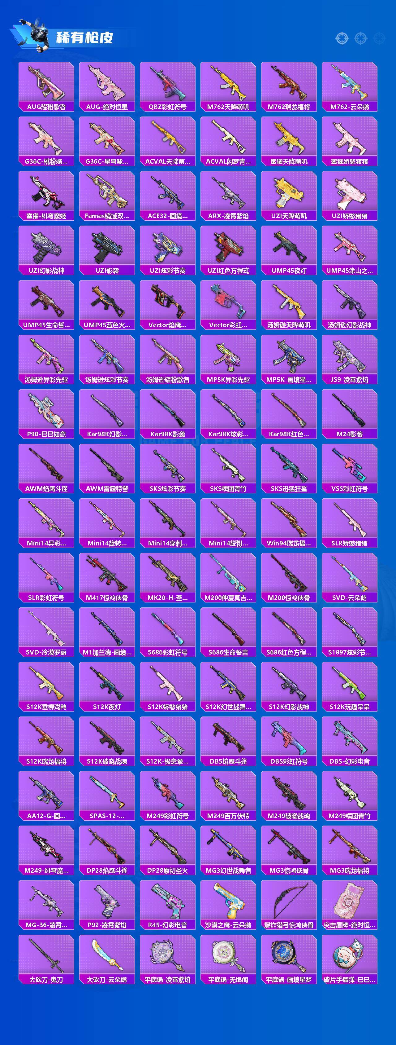【稀有枪皮】:AUG-冰晶雪宝,AKM-彩虹符号,AKM-江南烟雨,AKM-生命誓言,AKM-破晓战魂,AKM-虎虎生威,AKM-龙的传人,M16A4-幻世战舞者,SCAR-L-夜灯,SCAR-L-玉兔迎春,SCAR-L-红色方程式,SCAR-L-黄金龙骨,M416-糯团青竹,M416-红色方程式,M416-蓝色火焰,GROZA-异彩先驱,GROZA-影袭,AUG-天降萌叽,AUG-幻影战神,AU