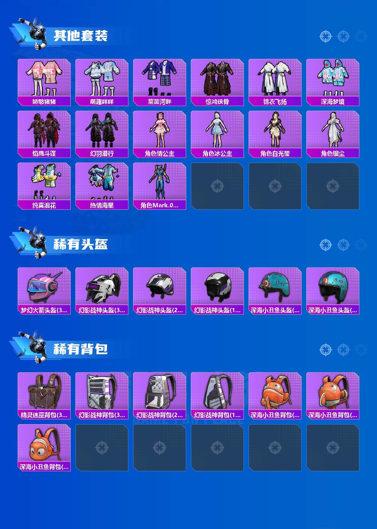 套装-深海小丑鱼,角色-圣堂之誓,套装-鹰眼刺客,套装-迅捷狂鲨