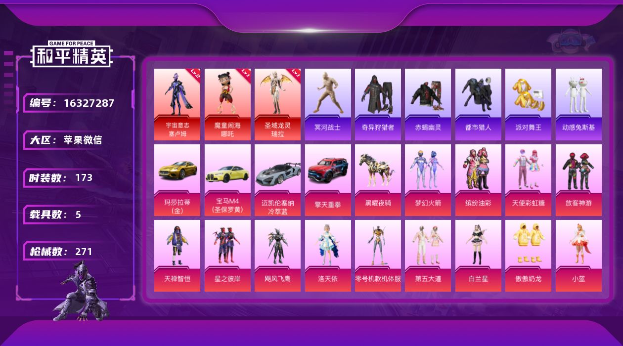 [16327287]3红装!男神套装!老木乃伊!苹果 微信-无敌战神框-3神装-16粉装-15特效枪-5载具-8粉色飞行器-96806热力值-11王牌印记-173套装-271枪皮