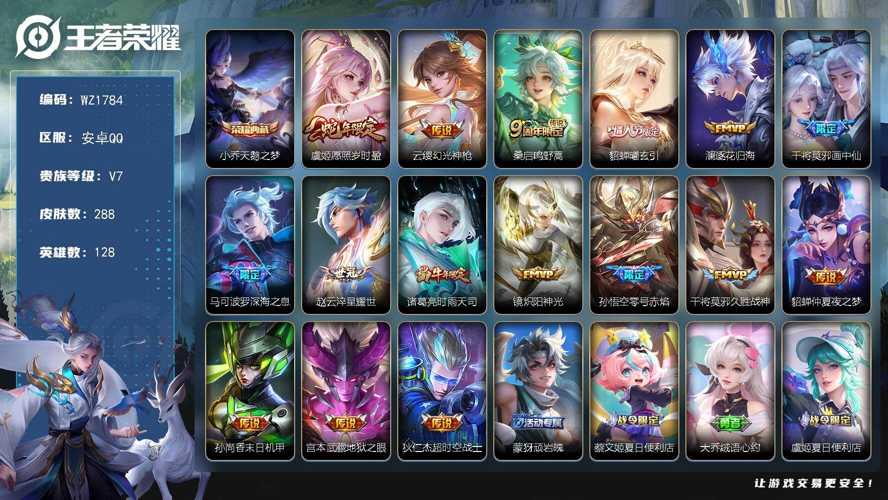 - [12007766]【商品标题】:安卓Q-V7-永恒钻石III段位-124英雄-348皮肤-1典藏-0珍品无双-0无双-0珍品传说-13传说-107史诗 【荣耀典藏】:貂蝉幻阙歌 【内测皮肤】:孙尚香蔷薇恋人,嬴政优雅恋人,狂铁特工战影 【传说皮肤】:李白凤求凰,貂蝉仲夏夜之梦,杨戬永曜之星,百里玄策白虎志,伽罗太华,虞姬启明星使,诸葛亮时雨天司,赵云乘龙铭钟鼎,孙策乘龙淬吴钩,孙尚香乘龙问璇玑,桑启鸣野蒿,云缨幻光神枪,虞姬愿照岁时盈 【限定皮肤】:白起狰,姜子牙天穹之誓,狄仁杰阴阳师,赵云皇家上将,墨子神迹守卫,妲己时之彼端,嬴政优雅恋人,孙尚香蔷薇恋人,鲁班七号狮舞东方,庄周高山流水,阿轲迷踪丽影,孙膑天狼运算者,扁鹊奇幻香踪,白起夜都怪侠,芈月重明,芈月白晶晶,吕布猎兽之王,周瑜赤莲之焰,元歌云间偶戏,元歌无心,夏侯惇朔风刀,甄姬幽恒,甄姬游园惊梦,曹操烛龙,曹操天狼征服者,典韦穷奇,典韦蓝屏警告,典韦岱宗,马可波罗暗影游猎,马可波罗山海玄木吟,狄仁杰魔术师,狄仁杰万华元夜,达摩沙漠行僧,项羽海滩派对,老夫子醍醐杖,老夫子航海奇遇记,关羽冰锋战神,安琪拉魔法小厨娘,程咬金演武夺筹,刘邦夺宝奇兵,韩信逐梦之影,韩信飞衡,兰陵王驯魔猎人,兰陵王金庭之子,亚瑟潮玩骑士王,孙悟空至尊宝,孙悟空大圣娶亲,牛魔御旌,后羿辉光之辰,后羿如梦令,李元芳银河之约,李元芳云中旅人,虞姬霸王别姬,虞姬启明星使,钟馗神迹守卫,钟馗驱傩正仪,杨玉环遇见飞天,杨戬永曜之星,杨戬潮玩骑兵,女娲朔望之晖,干将莫邪冰霜恋舞曲,雅典娜单词大作战,雅典娜黎明之约,蔡文姬繁星吟游,太乙真人饕餮,太乙真人华丽摇滚,鬼谷子原初探秘者,鬼谷子五谷丰年,诸葛亮时雨天司,黄忠烈魂,铠青龙志,苏烈千军破阵,百里玄策白虎志,百里守约朱雀志,弈星混沌棋,沈梦溪星空之诺,沈梦溪大漠名商,明世隐疑决卦,明世隐吟游魔法,裴擒虎天狼狩猎者,裴擒虎李小龙,裴擒虎擒涛扼浪,狂铁御狮,米莱狄御霄,云中君纤云弄巧,伽罗太华,盾山御銮,猪八戒西部大镖客,上官婉儿梁祝,上官婉儿天狼绘梦者,嫦娥拒霜思,蒙犽狂想玩偶喵,鲁班大师探海日志,桑启海盐诗旅,艾琳流音漫舞,司空震地狱燃心,阿古朵江河有灵,张良古海寻踪,裴擒虎梅西,蒙犽百解令,高渐离燃音魔法,妲己灵卜魔法,鬼谷子天穹祈灯,姬小满妄想食味,大乔乘龙忆丹青,安琪拉乘龙聚宝船,孙尚香乘龙问璇玑,孙策乘龙