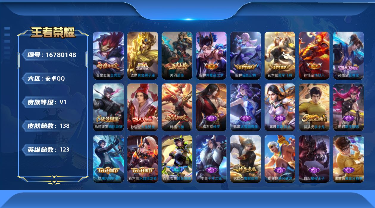 [16780148]安卓Q-138皮肤-7传说-35史诗 【传说皮肤】:关羽武圣,貂蝉猫影幻舞,达摩黄金狮子座,百里玄策白虎志,花木兰冠军飞将,貂蝉仲夏夜之梦,孙悟空地狱火 【限定皮肤】:狄仁杰阴阳师,赵云皇家上将,阿轲迷踪丽影,芈月重明,夏侯惇朔风刀,曹操烛龙,典韦穷奇,马可波罗暗影游猎,狄仁杰魔术师,狄仁杰万华元夜,项羽海滩派对,老夫子醍醐杖,关羽武圣,程咬金演武夺筹,刘邦夺宝奇兵,韩信飞衡,孙悟空至尊宝,孙悟空大圣娶亲,牛魔御旌,钟馗驱傩正仪,哪吒逐梦之翼,干将莫邪胡桃夹子,雅典娜单词大作战,蔡文姬繁星吟游,太乙真人饕餮,鬼谷子原初探秘者,百里玄策白虎志,百里玄策原初追逐者,弈星混沌棋,沈梦溪大漠名商,明世隐疑决卦,裴擒虎李小龙,狂铁御狮,米莱狄御霄,盾山御銮,猪八戒西部大镖客,蒙犽狂想玩偶喵,鲁班大师探海日志,桑启海盐诗旅,张良古海寻踪,鬼谷子天穹祈灯,百里玄策超元猎域,周瑜熔金海岸 【年限皮肤】:百里玄策白虎志,韩信飞衡 【赛季限定】:太乙真人饕餮,曹操烛龙,芈月重明,典韦穷奇,狂铁御狮,米莱狄御霄,牛魔御旌,盾山御銮,夏侯惇朔风刀,弈星混沌棋,明世隐疑决卦,老夫子醍醐杖,鬼谷子原初探秘者,狄仁杰万华元夜,程咬金演武夺筹,钟馗驱傩正仪,沈梦溪大漠名商,桑启海盐诗旅,鲁班大师探海日志,张良古海寻踪,鬼谷子天穹祈灯,百里玄策原初追逐者 【战令限定】:阿轲迷踪丽影,刘邦夺宝奇兵,马可波罗暗影游猎,猪八戒西部大镖客,蒙犽狂想玩偶喵,雅典娜单词大作战 【史诗皮肤】:露娜紫霞仙子,阿轲暗夜猫娘,赵云皇家上将,貂蝉圣诞恋歌,甄姬冰雪圆舞曲,王昭君偶像歌手,狄仁杰魔术师,宫本武藏鬼剑武藏,孙尚香水果甜心,嬴政摇滚巨星,墨子金属风暴,李白千年之狐,韩信白龙吟,孙悟空至尊宝,花木兰水晶猎龙者,刘邦德古拉伯爵,夏侯惇乘风破浪,兰陵王暗隐猎兽者,诸葛亮黄金分割率,亚瑟心灵战警,铠曙光守护者,哪吒逐梦之翼,白起星夜王子,孙悟空大圣娶亲,狄仁杰鹰眼统帅,蔡文姬繁星吟游,韩信飞衡,阿轲迷踪丽影,橘右京修罗,马可波罗暗影游猎,蒙犽狂想玩偶喵,百里玄策原初追逐者,裴擒虎李小龙,百里玄策热力回旋,百里玄策超元猎域 【其他皮肤】:项羽海滩派对,韩信教廷特使,韩信街头霸王,露娜哥特玫瑰,阿轲爱心护理,达摩大发明家,扁鹊化身博士,安琪拉玩偶对对碰,姜子牙时尚教父,妲己少女阿狸,典韦黄金武士,花木兰兔女郎,刘备万事如