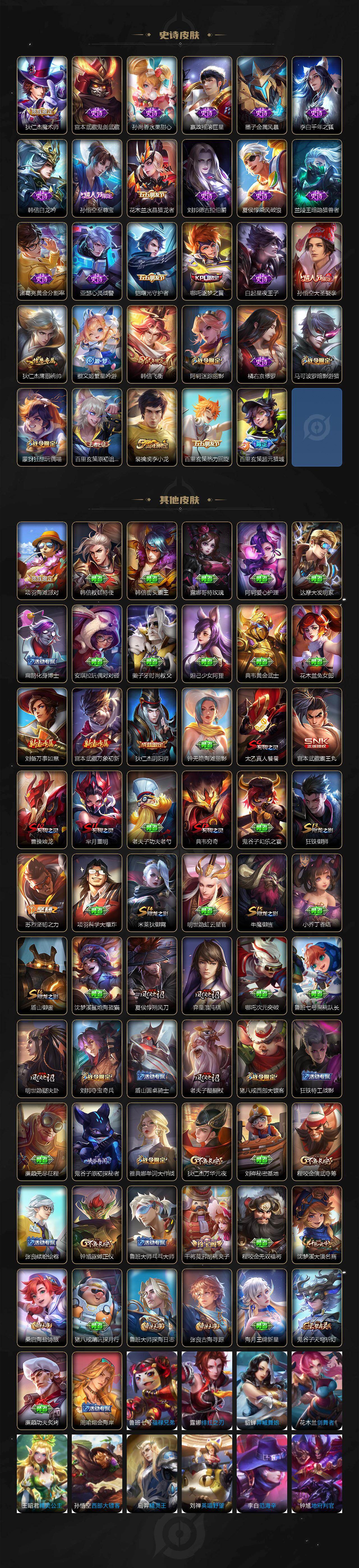 【史诗皮肤】:露娜紫霞仙子,阿轲暗夜猫娘,赵云皇家上将,貂蝉圣诞恋歌,甄姬冰雪圆舞曲,王昭君偶像歌手,狄仁杰魔术师,宫本武藏鬼剑武藏,孙尚香水果甜心,嬴政摇滚巨星,墨子金属风暴,李白千年之狐,韩信白龙吟,孙悟空至尊宝,花木兰水晶猎龙者,刘邦德古拉伯爵,夏侯惇乘风破浪,兰陵王暗隐猎兽者,诸葛亮黄金分割率,亚瑟心灵战警,铠曙光守护者,哪吒逐梦之翼,白起星夜王子,孙悟空大圣娶亲,狄仁杰鹰眼统帅,蔡文姬繁星吟游,韩信飞衡,阿轲迷踪丽影,橘右京修罗,马可波罗暗影游猎,蒙犽狂想玩偶喵,百里玄策原初追逐者,裴擒虎李小龙,百里玄策热力回旋,百里玄策超元猎域