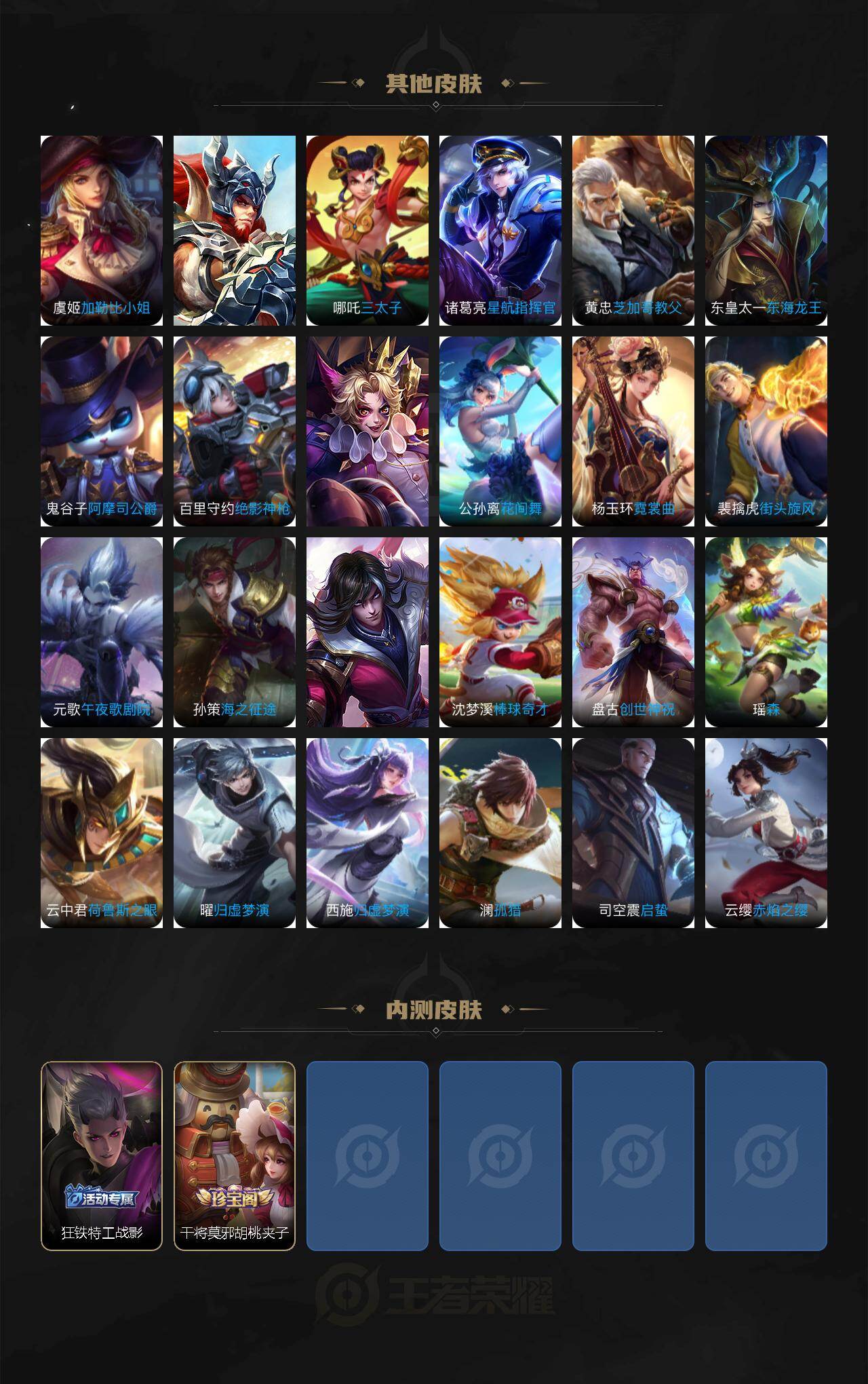 【赛季限定】:太乙真人饕餮,曹操烛龙,芈月重明,典韦穷奇,狂铁御狮,米莱狄御霄,牛魔御旌,盾山御銮,夏侯惇朔风刀,弈星混沌棋,明世隐疑决卦,老夫子醍醐杖,鬼谷子原初探秘者,狄仁杰万华元夜,程咬金演武夺筹,钟馗驱傩正仪,沈梦溪大漠名商,桑启海盐诗旅,鲁班大师探海日志,张良古海寻踪,鬼谷子天穹祈灯,百里玄策原初追逐者