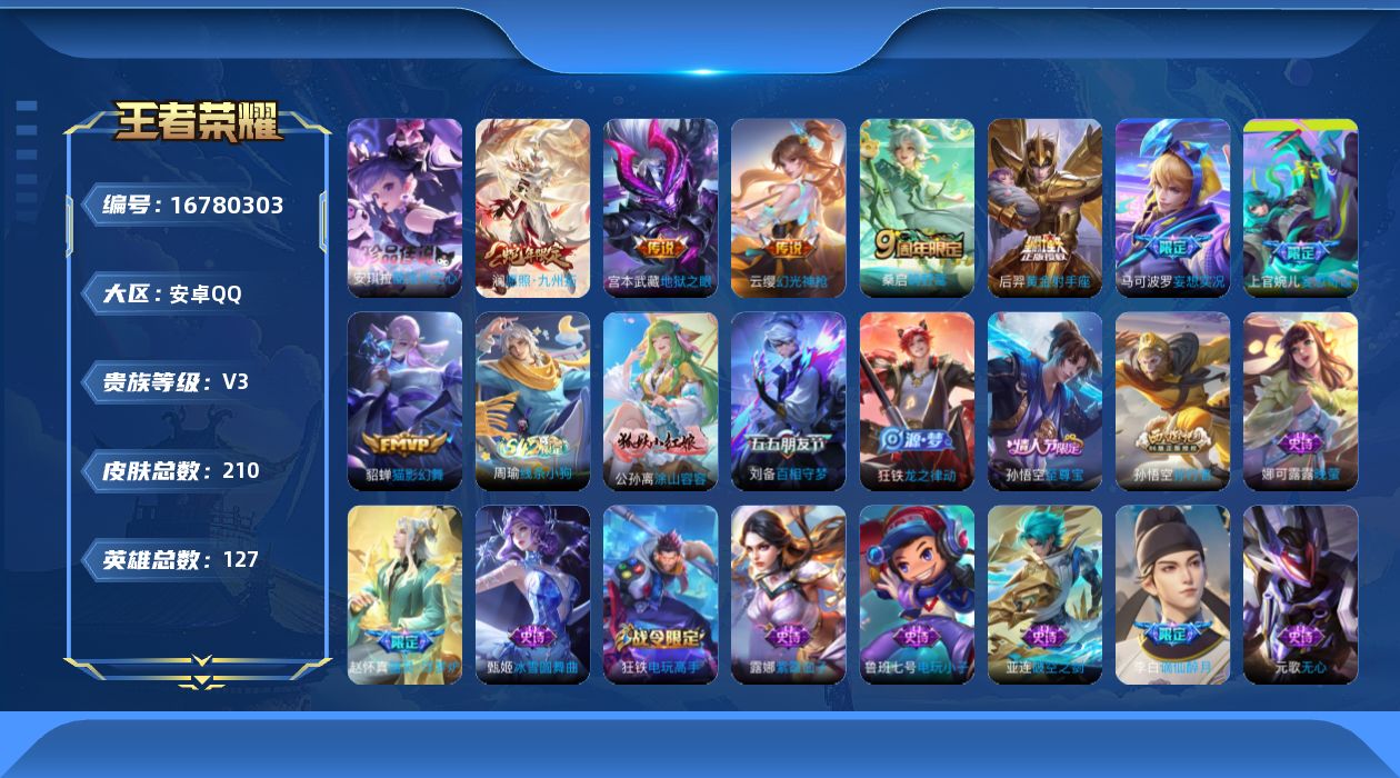 [16780303]安卓Q-210皮肤-1珍品传说-8传说-49史诗 【英雄全皮】:狂铁全皮 【珍品传说】:安琪拉酷洛米之心 【传说皮肤】:澜愿照九州拓,云缨幻光神枪,桑启鸣野蒿,上官婉儿妄想奇谈,马可波罗妄想实况,貂蝉猫影幻舞,后羿黄金射手座,宫本武藏地狱之眼 【限定皮肤】:白起狰,姜子牙天穹之誓,李白谪仙醉月,狄仁杰阴阳师,虞姬凯尔特女王,赵云皇家上将,孙尚香蔷薇恋人,庄周高山流水,钟无艳超时空战士,扁鹊奇幻香踪,芈月重明,元歌无心,夏侯惇朔风刀,甄姬游园惊梦,甄姬落雪兰心,曹操烛龙,典韦穷奇,马可波罗妄想实况,狄仁杰魔术师,达摩沙漠行僧,项羽海滩派对,程咬金演武夺筹,王昭君午后时光,兰陵王金庭之子,孙悟空至尊宝,孙悟空孙行者,牛魔御旌,刘备百相守梦,李元芳银河之约,李元芳云中旅人,钟馗驱傩正仪,杨戬潮玩骑兵,太乙真人饕餮,鬼谷子五谷丰年,苏烈千军破阵,沈梦溪大漠名商,裴擒虎擒涛扼浪,狂铁御狮,狂铁电玩高手,米莱狄御霄,盾山御銮,上官婉儿梁祝,上官婉儿妄想奇谈,嫦娥拒霜思,鲁班大师探海日志,桑启海盐诗旅,阿古朵江河有灵,张良古海寻踪,鬼谷子天穹祈灯,沈梦溪龙舞盛年,刘邦剑破天穹,周瑜熔金海岸 【年限皮肤】:澜愿照九州拓 【赛季限定】:虞姬凯尔特女王,白起狰,太乙真人饕餮,曹操烛龙,芈月重明,典韦穷奇,狂铁御狮,米莱狄御霄,牛魔御旌,盾山御銮,夏侯惇朔风刀,程咬金演武夺筹,钟馗驱傩正仪,苏烈千军破阵,达摩沙漠行僧,兰陵王金庭之子,沈梦溪大漠名商,李元芳云中旅人,桑启海盐诗旅,裴擒虎擒涛扼浪,鲁班大师探海日志,张良古海寻踪,鬼谷子天穹祈灯,刘邦剑破天穹,姜子牙天穹之誓,东皇太一噬灭天穹,太乙真人谧流熔炉,甄姬逆浪荇歌 【战令限定】:李元芳银河之约,狂铁电玩高手,王昭君午后时光,钟无艳超时空战士,甄姬落雪兰心,扁鹊奇幻香踪,杨戬潮玩骑兵,亚连破空之剑,孙悟空神迹守卫,周瑜线条小狗 【史诗皮肤】:鲁班七号电玩小子,露娜紫霞仙子,赵云皇家上将,赵云未来纪元,貂蝉圣诞恋歌,甄姬冰雪圆舞曲,王昭君偶像歌手,狄仁杰魔术师,廉颇地狱岩魂,宫本武藏鬼剑武藏,孙尚香蔷薇恋人,孙尚香水果甜心,嬴政摇滚巨星,妲己魅力维加斯,墨子金属风暴,吕布圣诞狂欢,吕布末日机甲,张飞乱世虎臣,孙悟空至尊宝,夏侯惇乘风破浪,小乔缤纷独角兽,甄姬游园惊梦,亚瑟心灵战警,雅典娜冰冠公主,安琪拉心灵骇客,李元芳逐浪之夏,阿轲节
