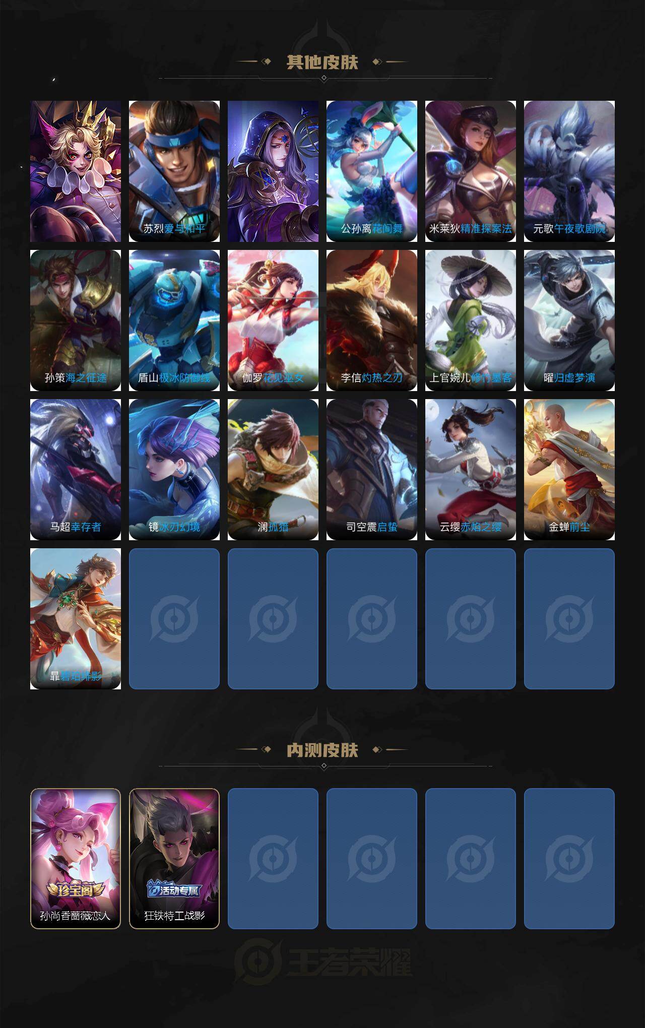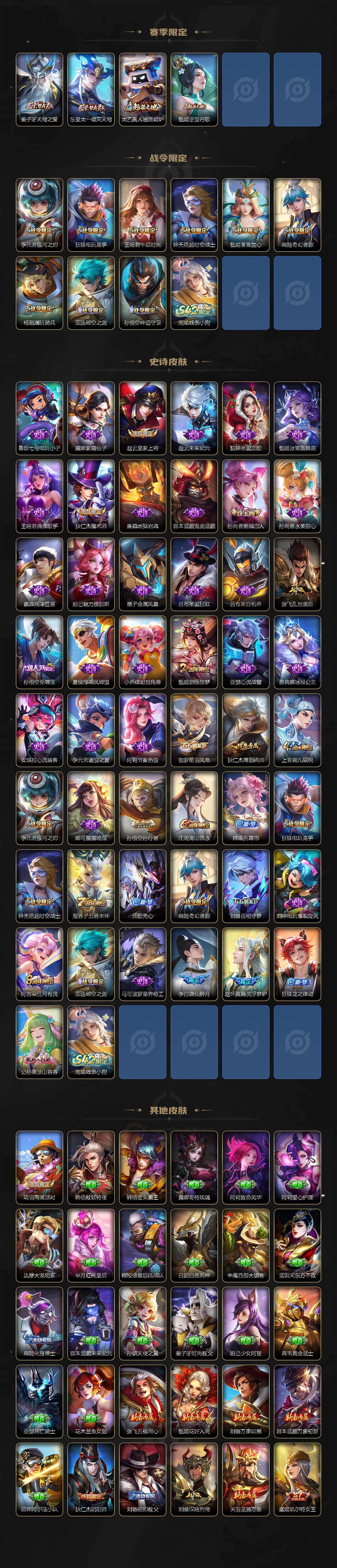 【赛季限定】:虞姬凯尔特女王,白起狰,太乙真人饕餮,曹操烛龙,芈月重明,典韦穷奇,狂铁御狮,米莱狄御霄,牛魔御旌,盾山御銮,夏侯惇朔风刀,程咬金演武夺筹,钟馗驱傩正仪,苏烈千军破阵,达摩沙漠行僧,兰陵王金庭之子,沈梦溪大漠名商,李元芳云中旅人,桑启海盐诗旅,裴擒虎擒涛扼浪,鲁班大师探海日志,张良古海寻踪,鬼谷子天穹祈灯,刘邦剑破天穹,姜子牙天穹之誓,东皇太一噬灭天穹,太乙真人谧流熔炉,甄姬逆浪荇歌