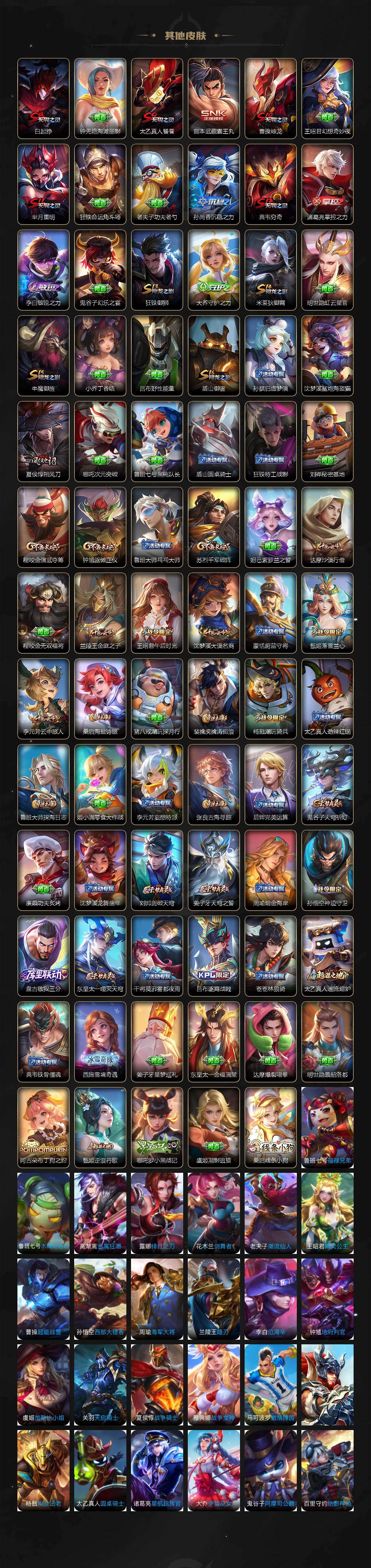 【限定皮肤】:白起狰,姜子牙天穹之誓,李白谪仙醉月,狄仁杰阴阳师,虞姬凯尔特女王,赵云皇家上将,孙尚香蔷薇恋人,庄周高山流水,钟无艳超时空战士,扁鹊奇幻香踪,芈月重明,元歌无心,夏侯惇朔风刀,甄姬游园惊梦,甄姬落雪兰心,曹操烛龙,典韦穷奇,马可波罗妄想实况,狄仁杰魔术师,达摩沙漠行僧,项羽海滩派对,程咬金演武夺筹,王昭君午后时光,兰陵王金庭之子,孙悟空至尊宝,孙悟空孙行者,牛魔御旌,刘备百相守梦,李元芳银河之约,李元芳云中旅人,钟馗驱傩正仪,杨戬潮玩骑兵,太乙真人饕餮,鬼谷子五谷丰年,苏烈千军破阵,沈梦溪大漠名商,裴擒虎擒涛扼浪,狂铁御狮,狂铁电玩高手,米莱狄御霄,盾山御銮,上官婉儿梁祝,上官婉儿妄想奇谈,嫦娥拒霜思,鲁班大师探海日志,桑启海盐诗旅,阿古朵江河有灵,张良古海寻踪,鬼谷子天穹祈灯,沈梦溪龙舞盛年,刘邦剑破天穹,周瑜熔金海岸