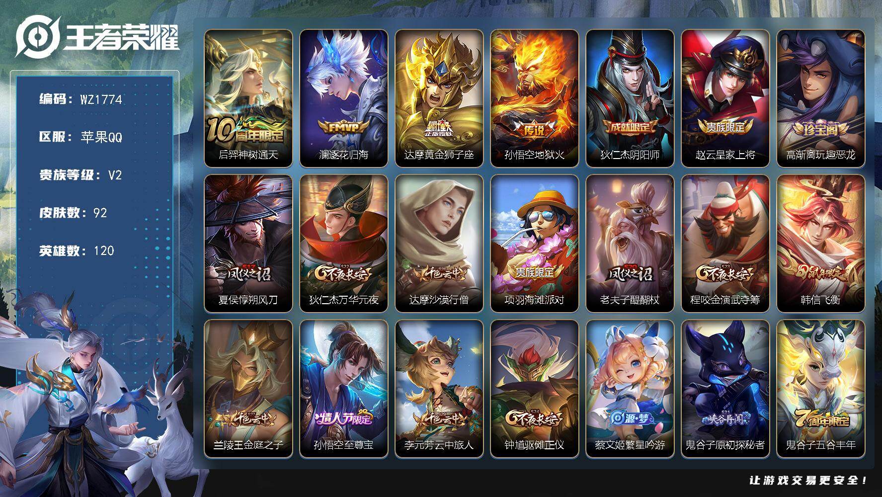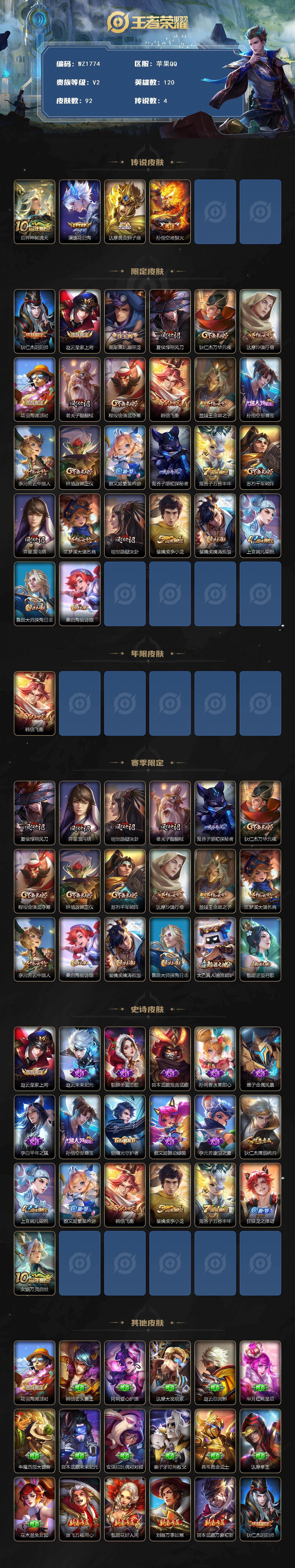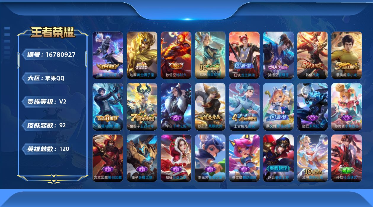 [16780927]苹果Q-92皮肤-4传说-19史诗 【英雄全皮】:孙权全皮 【传说皮肤】:后羿神树通天,澜逐花归海,达摩黄金狮子座,孙悟空地狱火 【限定皮肤】:狄仁杰阴阳师,赵云皇家上将,高渐离玩趣恶龙,夏侯惇朔风刀,狄仁杰万华元夜,达摩沙漠行僧,项羽海滩派对,老夫子醍醐杖,程咬金演武夺筹,韩信飞衡,兰陵王金庭之子,孙悟空至尊宝,李元芳云中旅人,钟馗驱傩正仪,蔡文姬繁星吟游,鬼谷子原初探秘者,鬼谷子五谷丰年,苏烈千军破阵,弈星混沌棋,沈梦溪大漠名商,明世隐疑决卦,裴擒虎李小龙,裴擒虎擒涛扼浪,上官婉儿梁祝,鲁班大师探海日志,桑启海盐诗旅 【年限皮肤】:韩信飞衡 【赛季限定】:夏侯惇朔风刀,弈星混沌棋,明世隐疑决卦,老夫子醍醐杖,鬼谷子原初探秘者,狄仁杰万华元夜,程咬金演武夺筹,钟馗驱傩正仪,苏烈千军破阵,达摩沙漠行僧,兰陵王金庭之子,沈梦溪大漠名商,李元芳云中旅人,桑启海盐诗旅,裴擒虎擒涛扼浪,鲁班大师探海日志,太乙真人谧流熔炉,甄姬逆浪荇歌 【史诗皮肤】:赵云皇家上将,赵云未来纪元,貂蝉圣诞恋歌,宫本武藏鬼剑武藏,孙尚香水果甜心,墨子金属风暴,李白千年之狐,孙悟空至尊宝,铠曙光守护者,蔡文姬舞动绿茵,李元芳逐浪之夏,狄仁杰鹰眼统帅,上官婉儿梁祝,蔡文姬繁星吟游,韩信飞衡,裴擒虎李小龙,鬼谷子五谷丰年,狂铁龙之律动,女娲万灵启世 【其他皮肤】:项羽海滩派对,韩信街头霸王,阿轲爱心护理,达摩大发明家,赵云忍炎影,芈月红桃皇后,牛魔西部大镖客,宫本武藏未来纪元,安琪拉玩偶对对碰,姜子牙时尚教父,典韦黄金武士,达摩拳王,花木兰兔女郎,张飞五福同心,甄姬花好人间,刘备万事如意,宫本武藏万象初新,狄仁杰阴阳师,刘备纽约教父,刘备汉昭烈帝,关羽龙腾万里,老夫子功夫老勺,诸葛亮掌控之力,李白敏锐之力,苏烈坚韧之力,吕布野性能量,高渐离玩趣恶龙,沈梦溪鲨炮海盗猫,夏侯惇朔风刀,弈星混沌棋,鲁班七号黑桃队长,明世隐疑决卦,盾山圆桌骑士,老夫子醍醐杖,狂铁特工战影,鬼谷子原初探秘者,狄仁杰万华元夜,杨戬次元傲视,程咬金演武夺筹,张良缤纷绘卷,钟馗驱傩正仪,苏烈千军破阵,达摩沙漠行僧,程咬金无双福将,兰陵王金庭之子,刘禅唤灵魔甲,沈梦溪大漠名商,李元芳云中旅人,桑启海盐诗旅,猪八戒潮玩探月行,裴擒虎擒涛扼浪,太乙真人劲辣红锅,鲁班大师探海日志,李元芳妄想特派,太乙真人谧流熔炉,西施雪境奇遇,姜子牙星梦