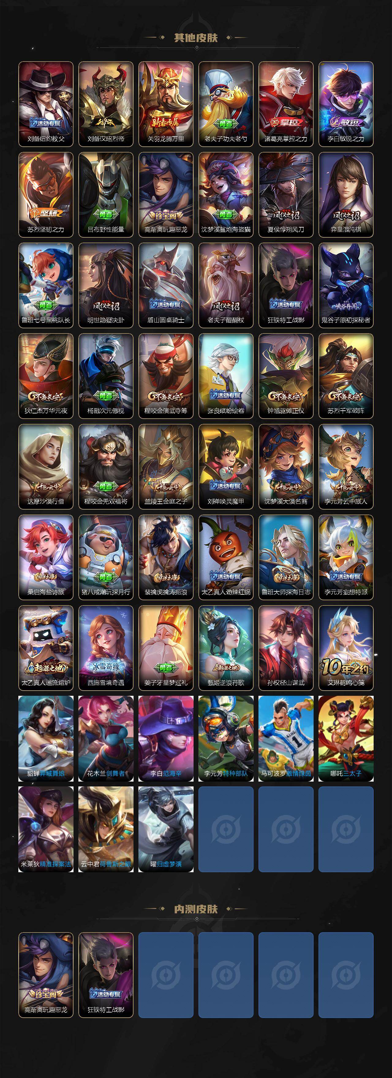【其他皮肤】:项羽海滩派对,韩信街头霸王,阿轲爱心护理,达摩大发明家,赵云忍炎影,芈月红桃皇后,牛魔西部大镖客,宫本武藏未来纪元,安琪拉玩偶对对碰,姜子牙时尚教父,典韦黄金武士,达摩拳王,花木兰兔女郎,张飞五福同心,甄姬花好人间,刘备万事如意,宫本武藏万象初新,狄仁杰阴阳师,刘备纽约教父,刘备汉昭烈帝,关羽龙腾万里,老夫子功夫老勺,诸葛亮掌控之力,李白敏锐之力,苏烈坚韧之力,吕布野性能量,高渐离玩趣恶龙,沈梦溪鲨炮海盗猫,夏侯惇朔风刀,弈星混沌棋,鲁班七号黑桃队长,明世隐疑决卦,盾山圆桌骑士,老夫子醍醐杖,狂铁特工战影,鬼谷子原初探秘者,狄仁杰万华元夜,杨戬次元傲视,程咬金演武夺筹,张良缤纷绘卷,钟馗驱傩正仪,苏烈千军破阵,达摩沙漠行僧,程咬金无双福将,兰陵王金庭之子,刘禅唤灵魔甲,沈梦溪大漠名商,李元芳云中旅人,桑启海盐诗旅,猪八戒潮玩探月行,裴擒虎擒涛扼浪,太乙真人劲辣红锅,鲁班大师探海日志,李元芳妄想特派,太乙真人谧流熔炉,西施雪境奇遇,姜子牙星梦