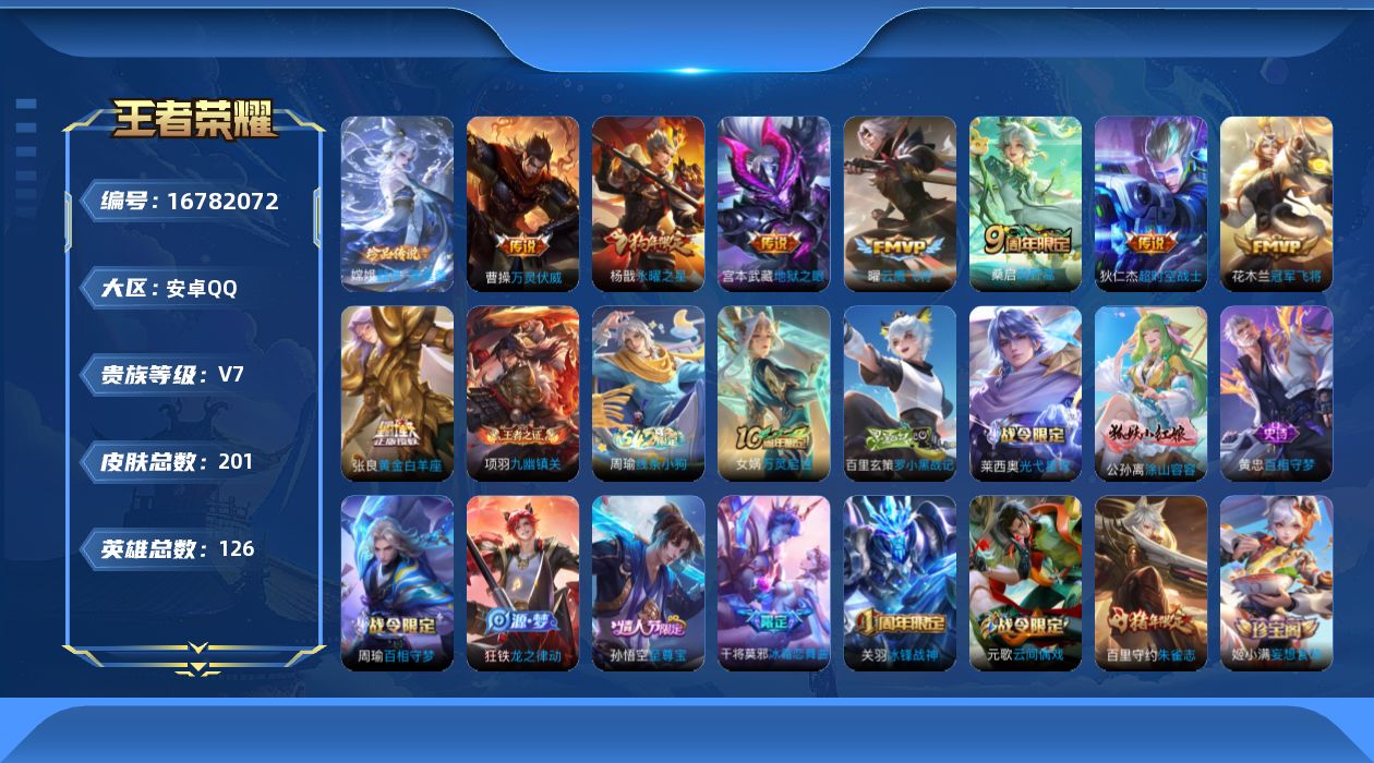 - [12116397]V7 1典藏 10传说 123英雄 323皮肤 可修改实名 优质装备:弑枪猎影(韩信典藏),涂山容容 传说皮:貂蝉曦玄引,幻光神枪 珍宝阁皮:万物之道,女武神,玩趣恶龙 限定皮:愿照·九州拓(澜年限),愿照·福禄聚(蔡文姬年限),愿照·岁时盈(虞姬年限),愿照·山河定(司空震年限),愿照·众生和(妲己年限),愿照·千秋盛(女娲年限),逐霄战戟,鸣野蒿,至尊宝,凤求凰(白切鸡),傲雪梅枪,神威(电光马子),飞衡(韩信年限),遇见飞天,高山流水,五谷丰年,青龙志(铠年限),冰锋战神,游园惊梦,梁祝,李小龙,逐梦之影,辉光之辰 史诗皮:化蝶舞,星界战将,龙之律动,百相守梦-周瑜,茶境仙,破空之剑,蔬乡物语(鲁班七号),百相守梦-百里守约,百相守梦-黄忠,织梦人,紫霞仙子,电玩小子(小书包),白龙吟,黄金分割率,特工魅影,千年之狐,江河有灵,魅语,百解令(蒙犽),高渐离燃音魔法,蒙恬荣光圣徽,青蛇,电玩·爆裂旋风,龙骑士(小龙虾),末日机甲-吕布,猫狗日记-孙策,猫狗日记-大乔,乱世虎臣,节奏热浪,女仆咖啡,摇滚巨星,水果甜心,绅士熊喵,天才门将,星夜王子,心灵骇客,时之奇旅-安琪拉,功夫厨神,德古拉伯爵,暗隐猎兽者,幽灵船长,鬼剑武藏,心灵战警,舞动绿茵,地狱岩魂,诗语江南,纤云弄巧,拒霜思,缤纷独角兽,乘风破浪,逐浪之夏,月团寄思,水晶猎龙者,曙光守护者,箭羽风息,金属风暴,原初追逐者,圣诞狂欢,圣诞恋歌,鹰眼统帅,黎明之约,赏金猎手,无心,未来纪元-赵云