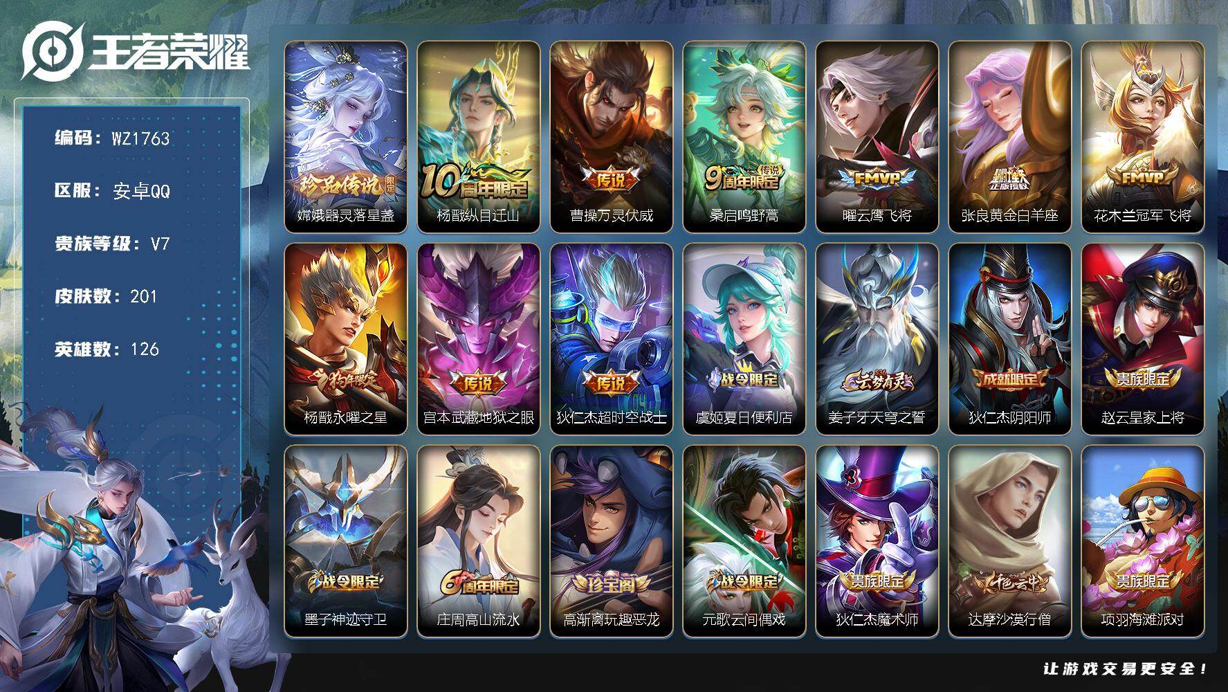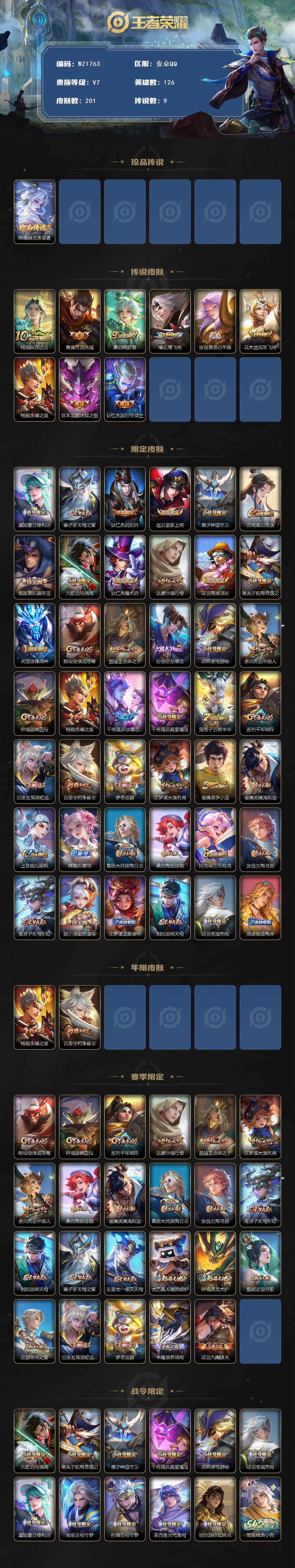 - [11445648]V7 1典藏 2珍品传说 9传说 124英雄 269皮肤 可修改实名 优质装备:鸣剑·曳影,大耳狗之梦,云鹰飞将(小将军),一念神魔,音你闪耀(rap皮),惊梅引,玄雷天君 珍品传说:时之奇旅-孙策 传说皮:幻光神枪 珍宝阁皮:优雅恋人,蔷薇恋人 限定皮:愿照·岁时盈(虞姬年限),逐霄战戟,鸣野蒿,夏侯惇霜北刀,梁祝,天狼溯光者,李小龙,逐梦之影,大圣娶亲 史诗皮:鸭鸭历险记-刘禅,器灵·浮梦炉,化蝶舞,星界战将,龙之律动,石田雨龙,茶境仙,撼地雄心,破空之剑,蒙犽顽岩魄,百相守梦-百里守约,百相守梦-黄忠,紫霞仙子,黄金分割率,特工魅影,千年之狐,银翎春语,蒙恬荣光圣徽,偶像歌手,白蛇,魅语,晚萤,青蛇,末日机甲-吕布,猫狗日记-孙策,猫狗日记-大乔,时之恋人-孙尚香,乱世虎臣,节奏热浪,修罗,女仆咖啡,摇滚巨星,水果甜心,绅士熊喵,天才门将,星夜王子,功夫厨神,暗隐猎兽者,幽灵船长,鬼剑武藏,乐园奇幻夜,天秀·启明,舞动绿茵,地狱岩魂,纤云弄巧,繁星吟游(呼啦呼啦),拒霜思,乘风破浪,水晶猎龙者,热力回旋,箭羽风息,圣诞恋歌,鹰眼统帅,暗夜贵公子,魅力维加斯,黎明之约,赏金猎手,奇遇舞章,天秀·音浪