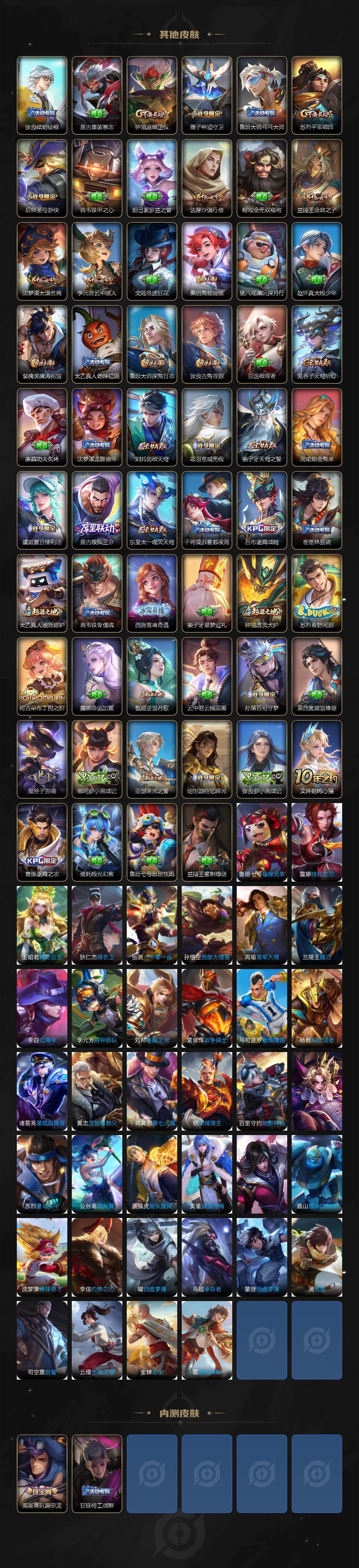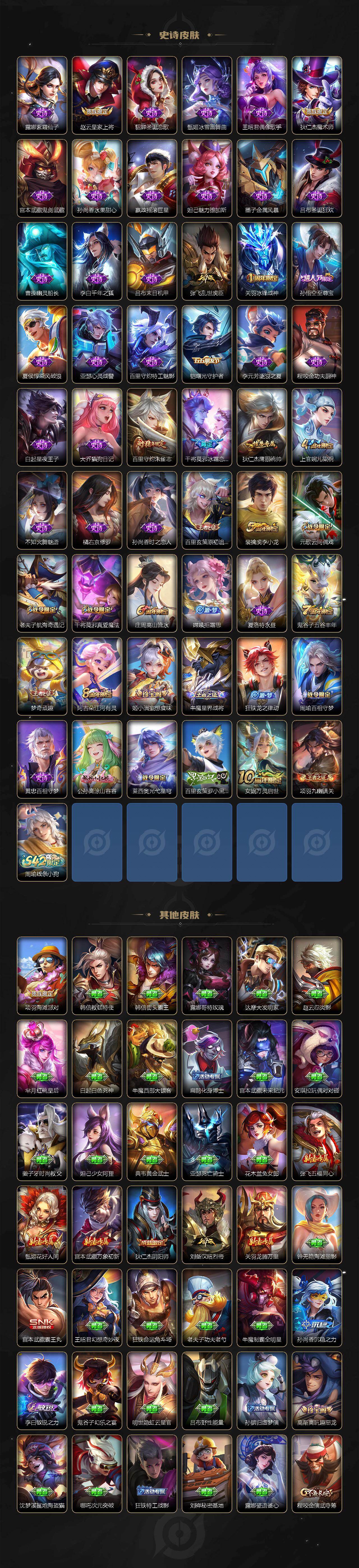 【限定皮肤】:虞姬夏日便利店,姜子牙天穹之誓,狄仁杰阴阳师,赵云皇家上将,墨子神迹守卫,庄周高山流水,高渐离玩趣恶龙,元歌云间偶戏,狄仁杰魔术师,达摩沙漠行僧,项羽海滩派对,老夫子航海奇遇记,关羽冰锋战神,程咬金演武夺筹,兰陵王金庭之子,孙悟空至尊宝,后羿圣弓游侠,李元芳云中旅人,钟馗驱傩正仪,杨戬永曜之星,干将莫邪冰霜恋舞曲,干将莫邪真爱魔法,鬼谷子五谷丰年,苏烈千军破阵,百里玄策原初追逐者,百里守约朱雀志,梦奇顽趣,沈梦溪大漠名商,裴擒虎李小龙,裴擒虎擒涛扼浪,上官婉儿梁祝,嫦娥拒霜思,鲁班大师探海日志,桑启海盐诗旅,阿古朵江河有灵,张良古海寻踪,鬼谷子天穹祈灯,姬小满妄想食味,沈梦溪龙舞盛年,刘邦剑破天穹,项羽苍威无极,周瑜熔金海岸