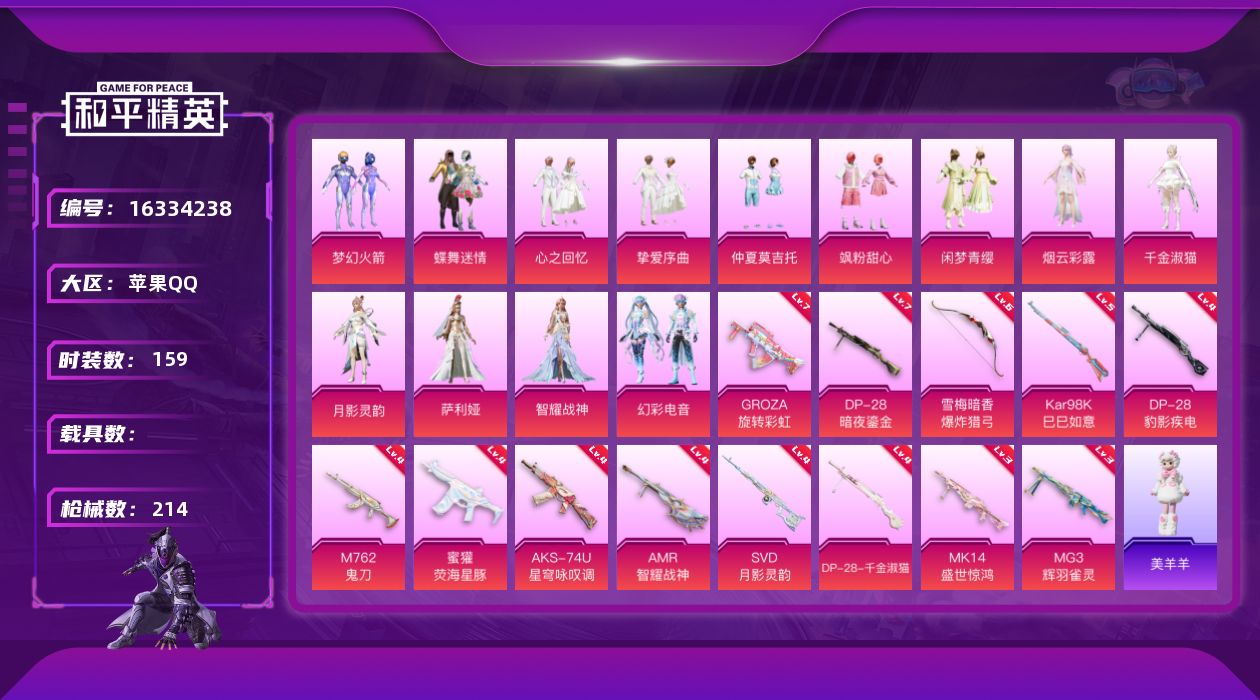 [16334238]苹果 手Q-13粉装-13特效枪-0载具-5粉色飞行器-75973热力值-1王牌印记-159套装-214枪皮 【热门品类】:粉装-梦幻火箭,套装-龟仙人 【粉色套装】:粉装-蝶舞迷情,粉装-梦幻火箭,粉装-心之回忆,粉装-挚爱序曲,粉装-仲夏莫吉托,粉装-飒粉甜心,粉装-闲梦青缨,角色-烟云彩露,角色-千金淑猫,角色-月影灵韵,角色-萨利娅,角色-智耀战神,粉装-幻彩电音 【粉色枪皮等级】:GROZA-旋转彩虹(七级),M762-鬼刀(四级),蜜獾-荧海星豚(四级),AKS-74U-星穹咏叹调(四级),Kar98K-巳巳如意(五级),Mk14-盛世惊鸿(三级),AMR-智耀战神(四级),SVD-月影灵韵(四级),DP-28-暗夜鎏金(七级),DP-28-千金淑猫(四级),DP-28-豹影疾电(四级),MG3-辉羽雀灵(三级),爆炸猎弓-雪梅暗香(六级) 【粉色枪皮】:GROZA-旋转彩虹,M762-鬼刀,蜜獾-荧海星豚,AKS-74U-星穹咏叹调,Kar98K-巳巳如意,Mk14-盛世惊鸿,AMR-智耀战神,SVD-月影灵韵,DP-28-暗夜鎏金,DP-28-千金淑猫,DP-28-豹影疾电,MG3-辉羽雀灵,爆炸猎弓-雪梅暗香 【粉色飞行器】:酣梦熊熊飞行器,凤舞九天飞行器,圣域金龙飞行器,雀灵庇佑飞行器 【粉色降落伞】:甜心宝贝降落伞,暗夜玫瑰降落伞,第五大道降落伞,仲夏莫吉托降落伞,飒粉甜心降落伞,圣堂之誓降落伞,精灵梦叶罗丽降落伞,创世·救赎降落伞,金丰海韵降落伞,千金淑猫降落伞,月影灵韵降落伞,盛世惊鸿降落伞,鬼刀降落伞,樱桃泡泡降落伞,智耀战神降落伞,绯果甜心降落伞,星穹咏叹调降落伞,辉羽雀灵降落伞,幻彩电音降落伞,荧海星豚降落伞,绯穹魔姬降落伞 【稀有套装】:套装-龟仙人,套装-巳巳如意,套装-雏菊兔兔,套装-萝兰蝴蝶,套装-小熊娃娃,角色-狂花道·娜可露露,角色-狂花道·雅典娜,套装-糖糖葫芦,套装-青团波波,角色-都市丽猫,角色-摩登魅猫,角色-许七安,角色-俏兔智灵,角色-光矢逐梦,套装-燕燕于飞,套装-鱼渊荷华,角色-风玲,角色-海琴烟,套装-晶辉守护,角色-蜜桃派对,套装-粉恋花,套装-紫幽梦,套装-蓝冰羽,角色-猎影月神,角色-瑰梦爱神,套装-星影赞美诗,套装-星渊小夜曲,套装-极速光影,套装-云朵鹅,套装-雪绒豹,玩偶服-美羊羊 【稀有枪