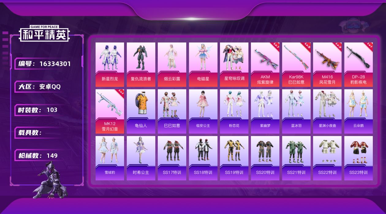 [16334301]安卓 手Q-5粉装-5特效枪-0载具-0粉色飞行器-43120热力值-9王牌印记-103套装-149枪皮