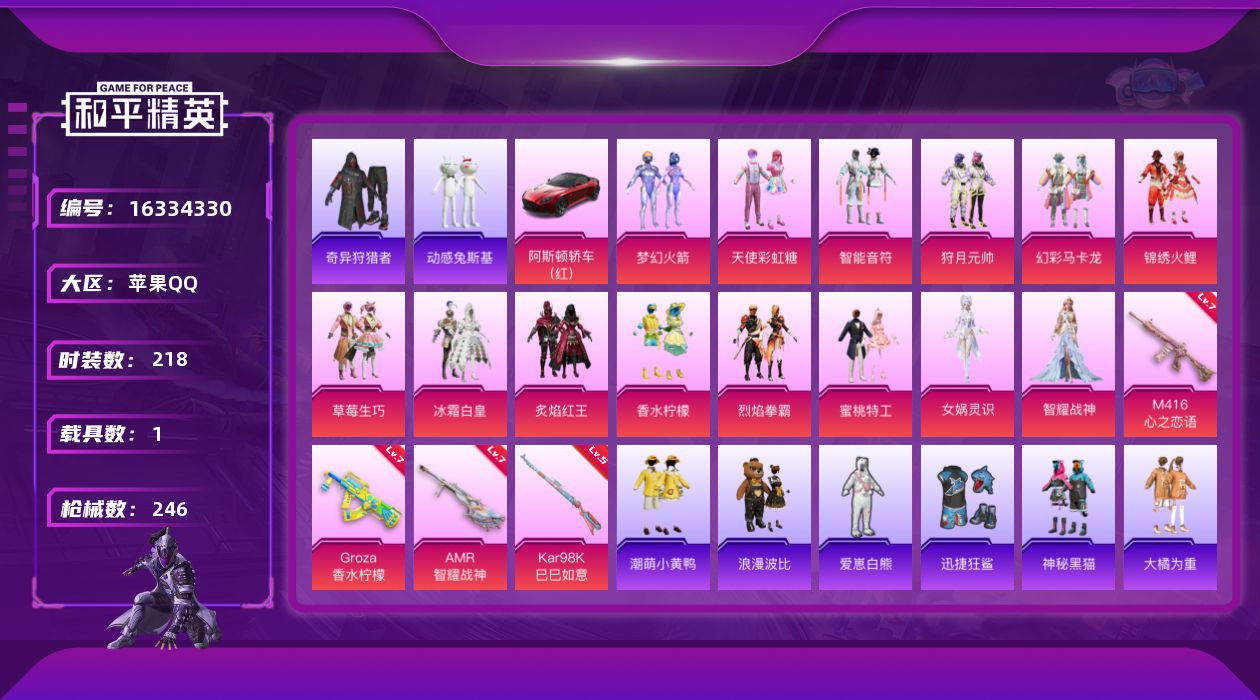 [16334330]苹果 手Q-14粉装-4特效枪-1载具-4粉色飞行器-93971热力值-13王牌印记-218套装-246枪皮