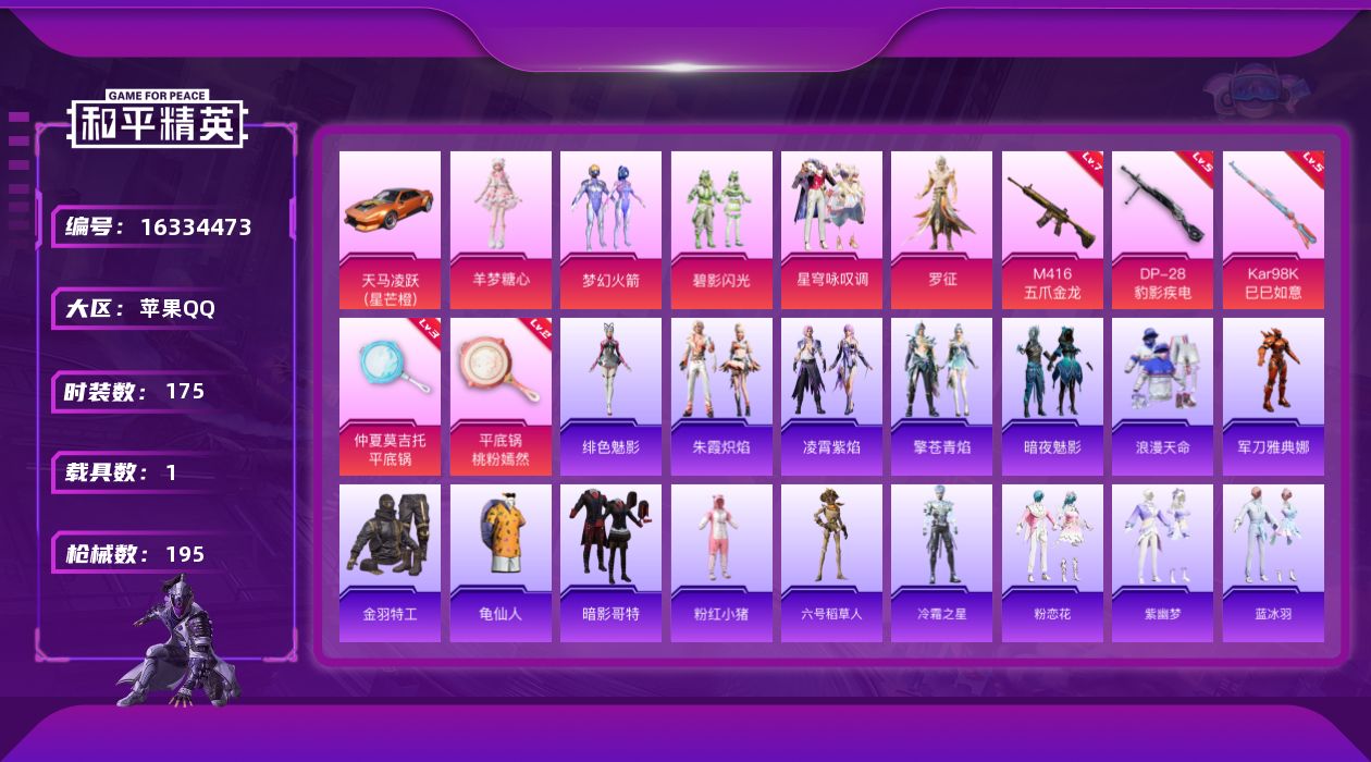 [16334473]苹果 手Q-5粉装-5特效枪-1载具-2粉色飞行器-64803热力值-13王牌印记-175套装-195枪皮