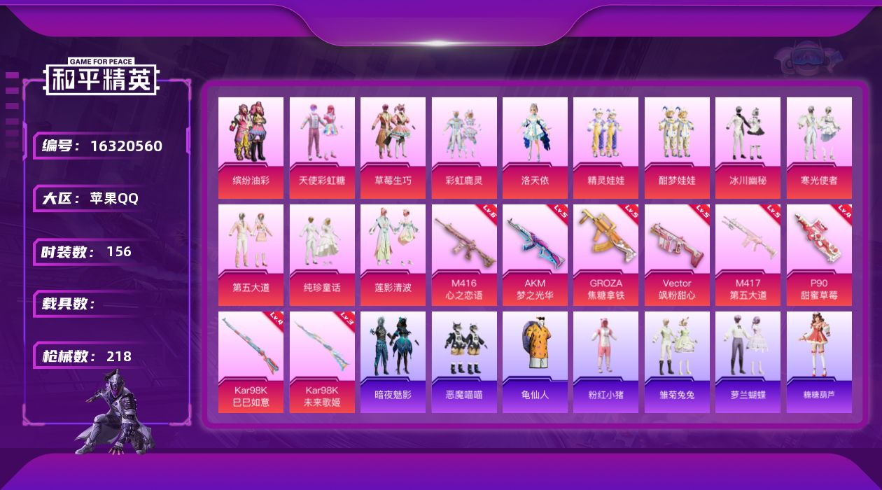 [16320560]苹果 手Q-12粉装-8特效枪-0载具-2粉色飞行器-74248热力值-12王牌印记-156套装-218枪皮