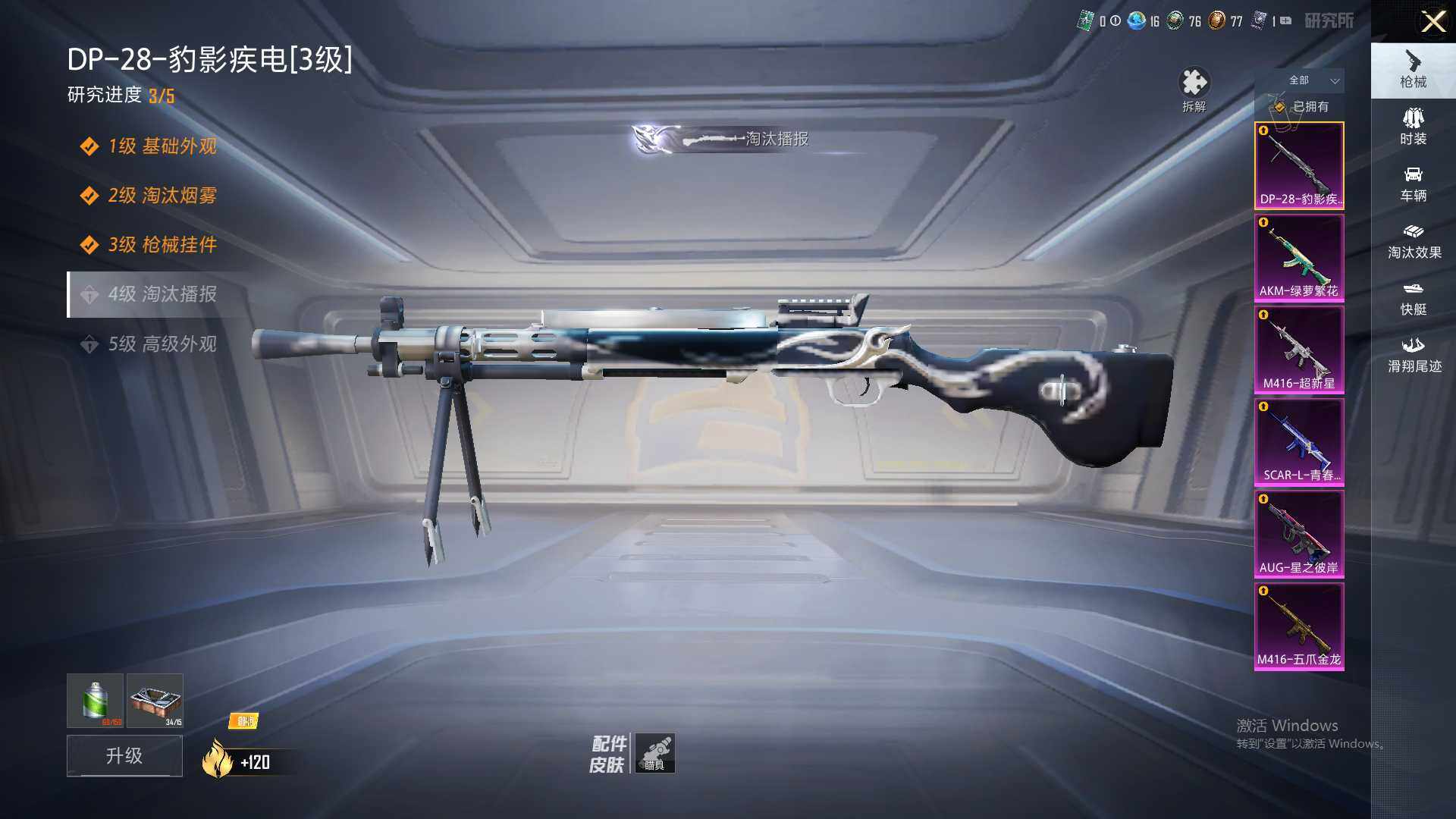 【粉色枪皮等级】:AKM-绿萝繁花(五级),SCAR-L-青春物语(四级),M416-五爪金龙(一级),M416-超新星(八级),AUG-星之彼岸(四级),DP-28-豹影疾电(三级)