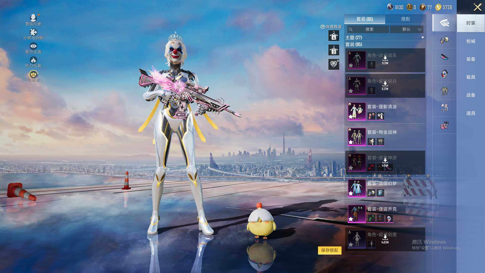 【粉色套装】:粉装-怪诞乔克,粉装-雪国幻梦,粉装-放客神游,粉装-绚金战神,粉装-莲影清波,角色-冰炎战车,角色-紫钛骑兵