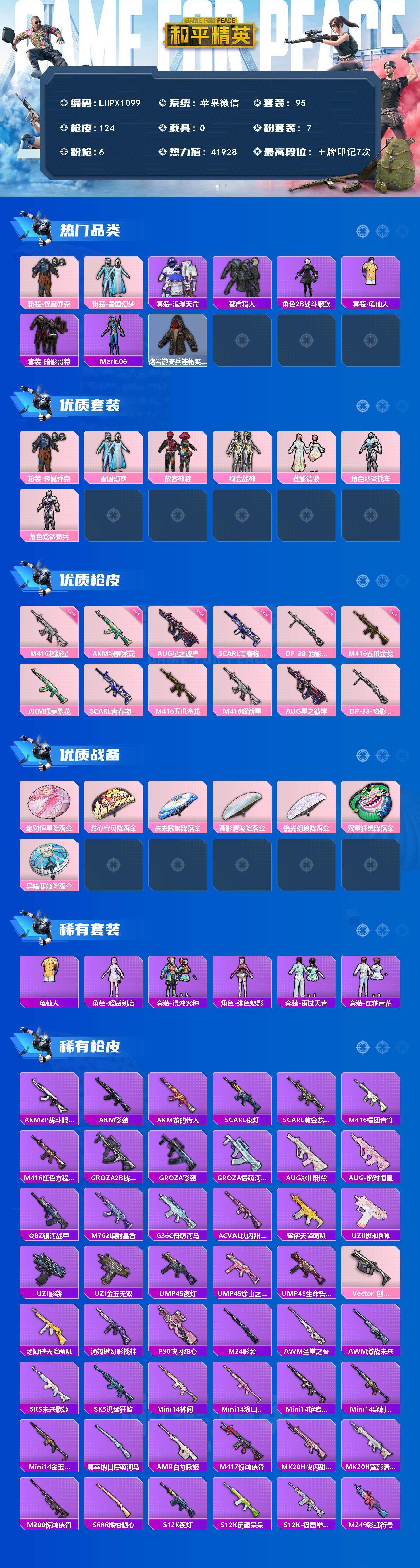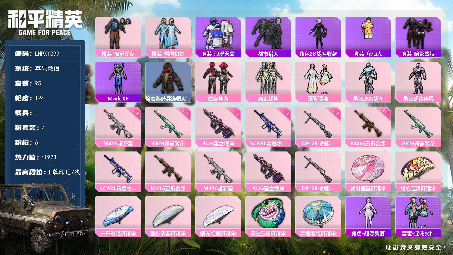 [16783532]【特价出售/店主推荐】苹果 微信-7粉装-6特效枪-0载具-1粉色飞行器-41928热力值-7王牌印记-95套装-124枪皮 【热门品类】:粉装-怪诞乔克,粉装-雪国幻梦,套装-浪漫天命,套装-都市猎人,角色-2B战斗服款,套装-龟仙人,套装-暗影哥特,角色-Mark.06,熔岩游骑兵连帽夹克 【粉色套装】:粉装-怪诞乔克,粉装-雪国幻梦,粉装-放客神游,粉装-绚金战神,粉装-莲影清波,角色-冰炎战车,角色-紫钛骑兵 【粉色枪皮等级】:AKM-绿萝繁花(五级),SCAR-L-青春物语(四级),M416-五爪金龙(一级),M416-超新星(八级),AUG-星之彼岸(四级),DP-28-豹影疾电(三级) 【粉色枪皮】:AKM-绿萝繁花,SCAR-L-青春物语,M416-五爪金龙,M416-超新星,AUG-星之彼岸,DP-28-豹影疾电 【粉色飞行器】:炫彩糖果飞行器 【粉色降落伞】:绝对恒星降落伞,甜心宝贝降落伞,未来歌姬降落伞,莲影清波降落伞,镜光幻境降落伞,双重狂想降落伞,异瞳寒姬降落伞,炫彩糖果降落伞 【稀有套装】:套装-龟仙人,角色-超感刻度,套装-雪国风尚,套装-炫彩糖果,套装-混沌火种,角色-绯色魅影,套装-雨过天青,套装-红釉青花 【稀有枪皮】:AUG-冰晶雪宝,AKM-2P战斗服款,AKM-影袭,AKM-龙的传人,SCAR-L-夜灯,SCAR-L-黄金龙骨,M416-糯团青竹,M416-红色方程式,GROZA-2B战斗服款,GROZA-影袭,GROZA-懵萌河马,AUG-冰川粉黛,AUG-绝对恒星,QBZ-银河战甲,M762-镭射皇者,G36C-懵萌河马,AC-VAL-快闪甜心,蜜獾-天降萌叽,UZI-啾咪啾咪,UZI-影袭,UZI-金玉无双,UMP45-夜灯,UMP45-涂山之恋,UMP45-生命誓言,Vector-创世·救赎,汤姆逊-天降萌叽,汤姆逊-幻影战神,P90-快闪甜心,M24-影袭,AWM-圣堂之誓,AWM-激战未来,SKS-未来歌姬,SKS-迅猛狂鲨,Mini14-林间仙鹿,Mini14-涂山之恋,Mini14-熔岩统帅,Mini14-穿刺龙虾,Mini14-金玉无双,莫辛纳甘-懵萌河马,AMR-白勺歌姬,M417-惊鸿侠骨,MK20-H-快闪甜心,MK20-H-莲影清波,M200-惊鸿侠骨,S686-橘柚倾心,S12K-玩趣呆呆,S1