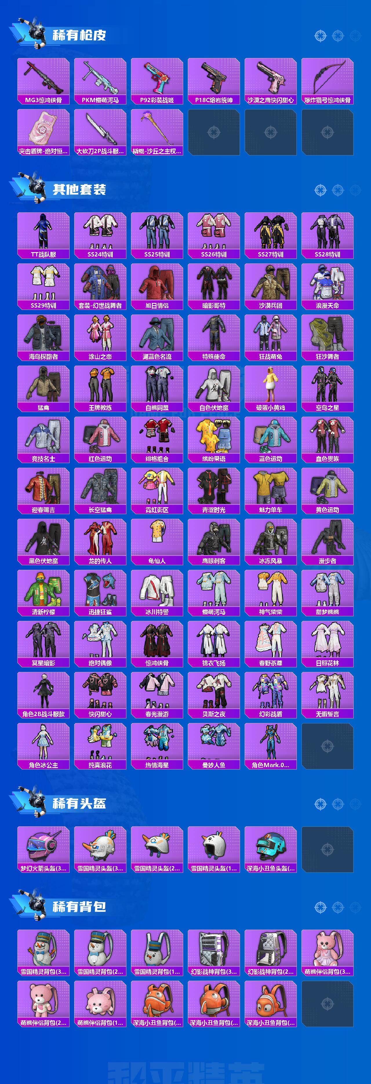 【稀有枪皮】:AUG-冰晶雪宝,AKM-2P战斗服款,AKM-影袭,AKM-龙的传人,SCAR-L-夜灯,SCAR-L-黄金龙骨,M416-糯团青竹,M416-红色方程式,GROZA-2B战斗服款,GROZA-影袭,GROZA-懵萌河马,AUG-冰川粉黛,AUG-绝对恒星,QBZ-银河战甲,M762-镭射皇者,G36C-懵萌河马,AC-VAL-快闪甜心,蜜獾-天降萌叽,UZI-啾咪啾咪,UZI-影袭,UZI-金玉无双,UMP45-夜灯,UMP45-涂山之恋,UMP45-生命誓言,Vector-创世·救赎,汤姆逊-天降萌叽,汤姆逊-幻影战神,P90-快闪甜心,M24-影袭,AWM-圣堂之誓,AWM-激战未来,SKS-未来歌姬,SKS-迅猛狂鲨,Mini14-林间仙鹿,Mini14-涂山之恋,Mini14-熔岩统帅,Mini14-穿刺龙虾,Mini14-金玉无双,莫辛纳甘-懵萌河马,AMR-白勺歌姬,M417-惊鸿侠骨,MK20-H-快闪甜心,MK20-H-莲影清波,M200-惊鸿侠骨,S686-橘柚倾心,S12K-玩趣呆呆,S1