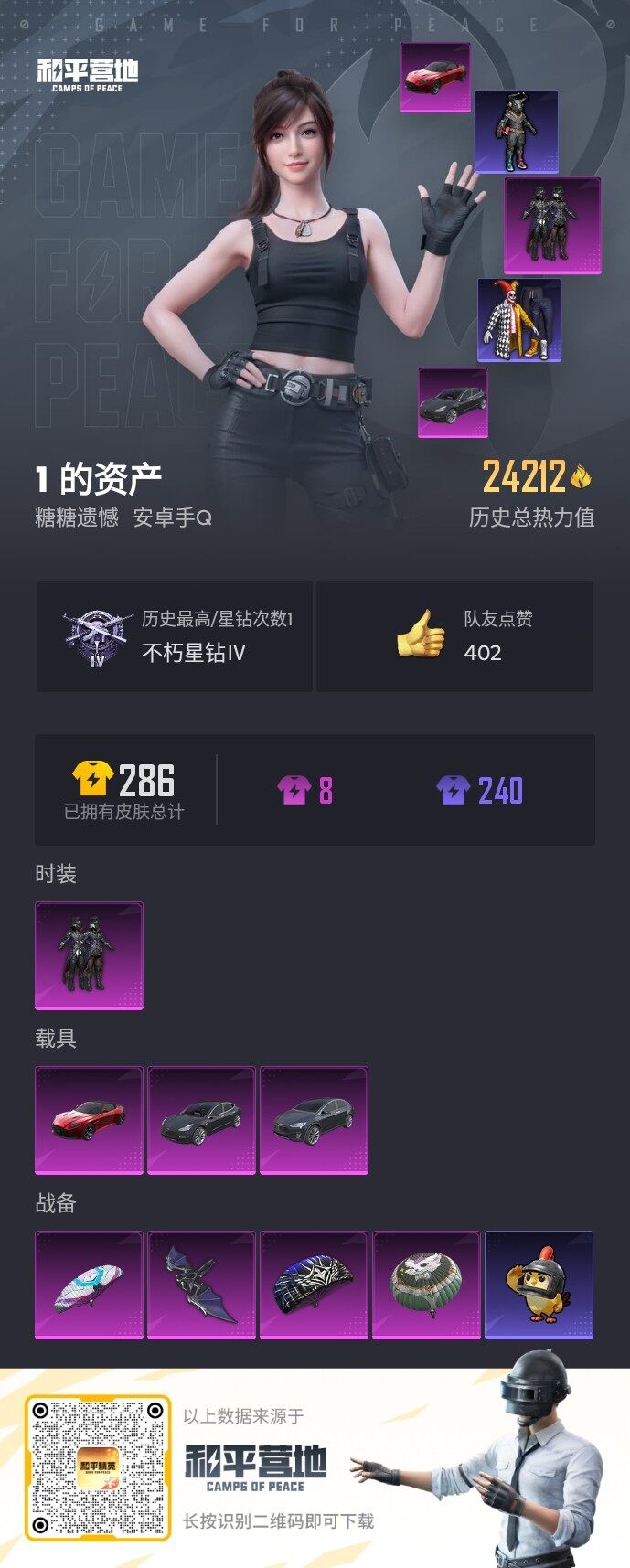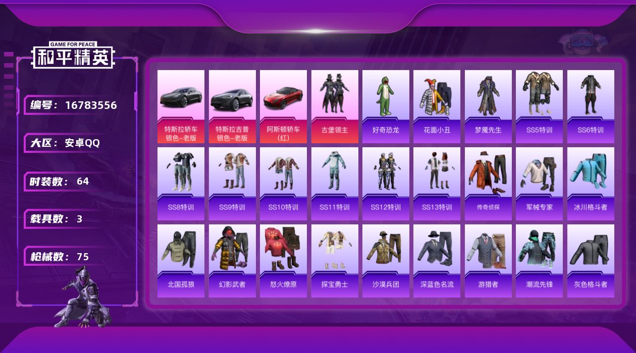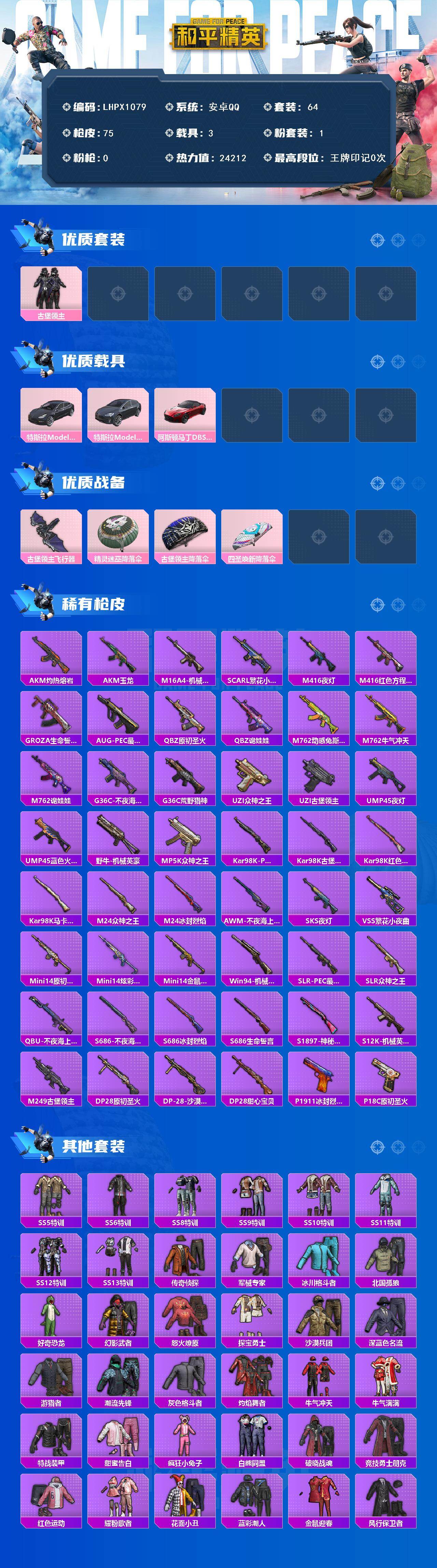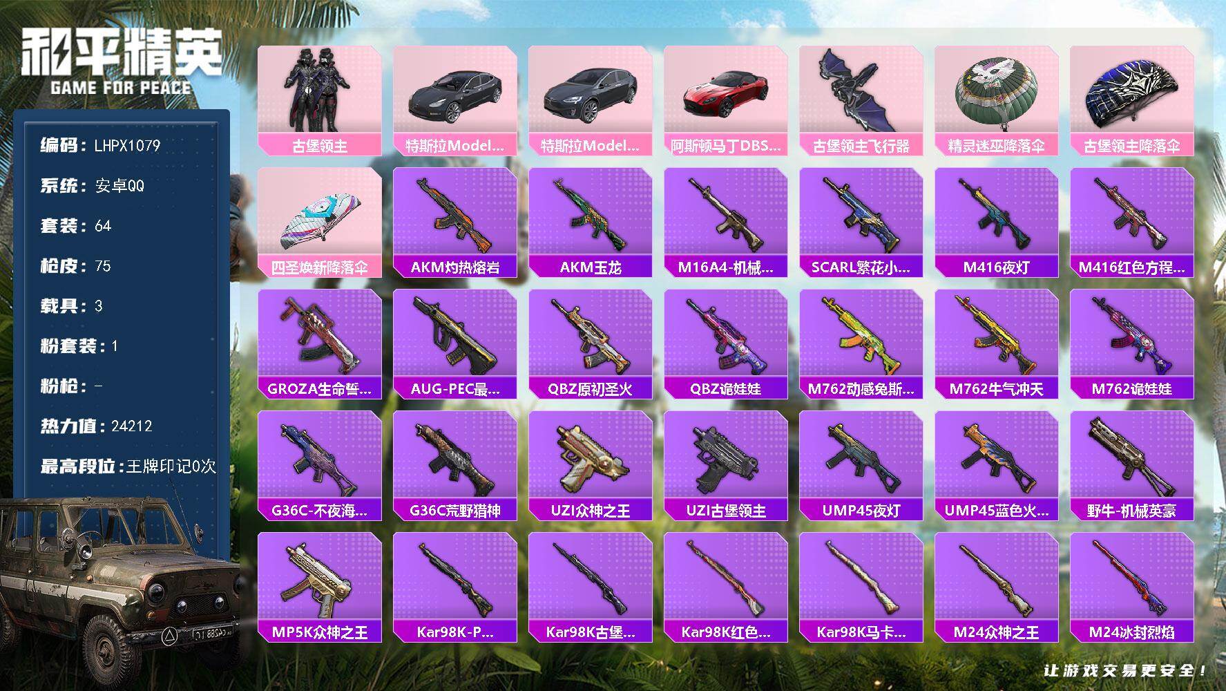 [16783556]【店主推荐捡漏号!可直接换绑】安卓 手Q-1粉装-0特效枪-3载具-1粉色飞行器-24212热力值-2王牌印记-64套装-75枪皮【粉色套装】:粉装-古堡领主【粉色载具】:特斯拉Model 3(冷光银),特斯拉Model X(冷光银),阿斯顿马丁DBS(红)【粉色飞行器】:古堡领主飞行器