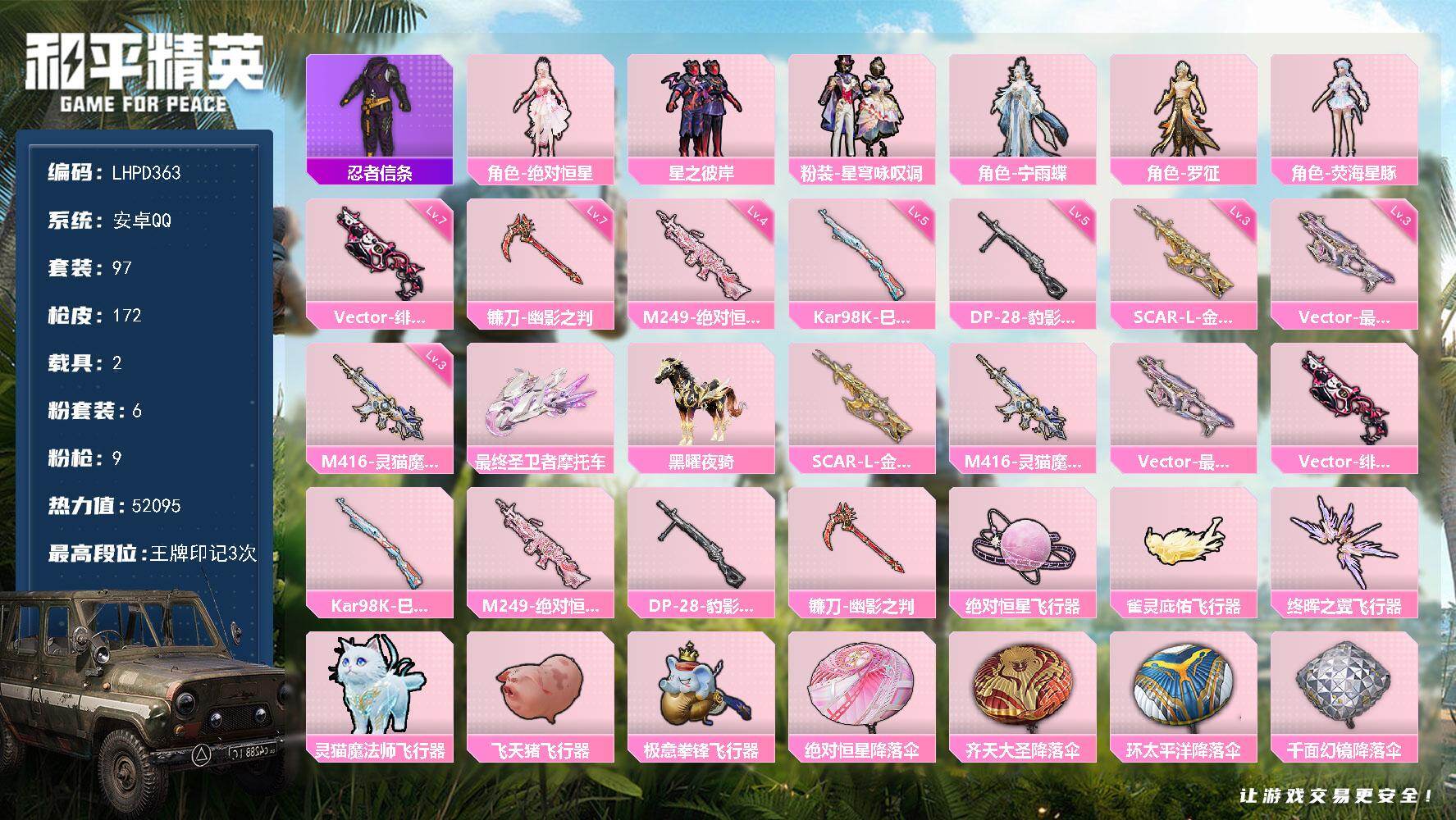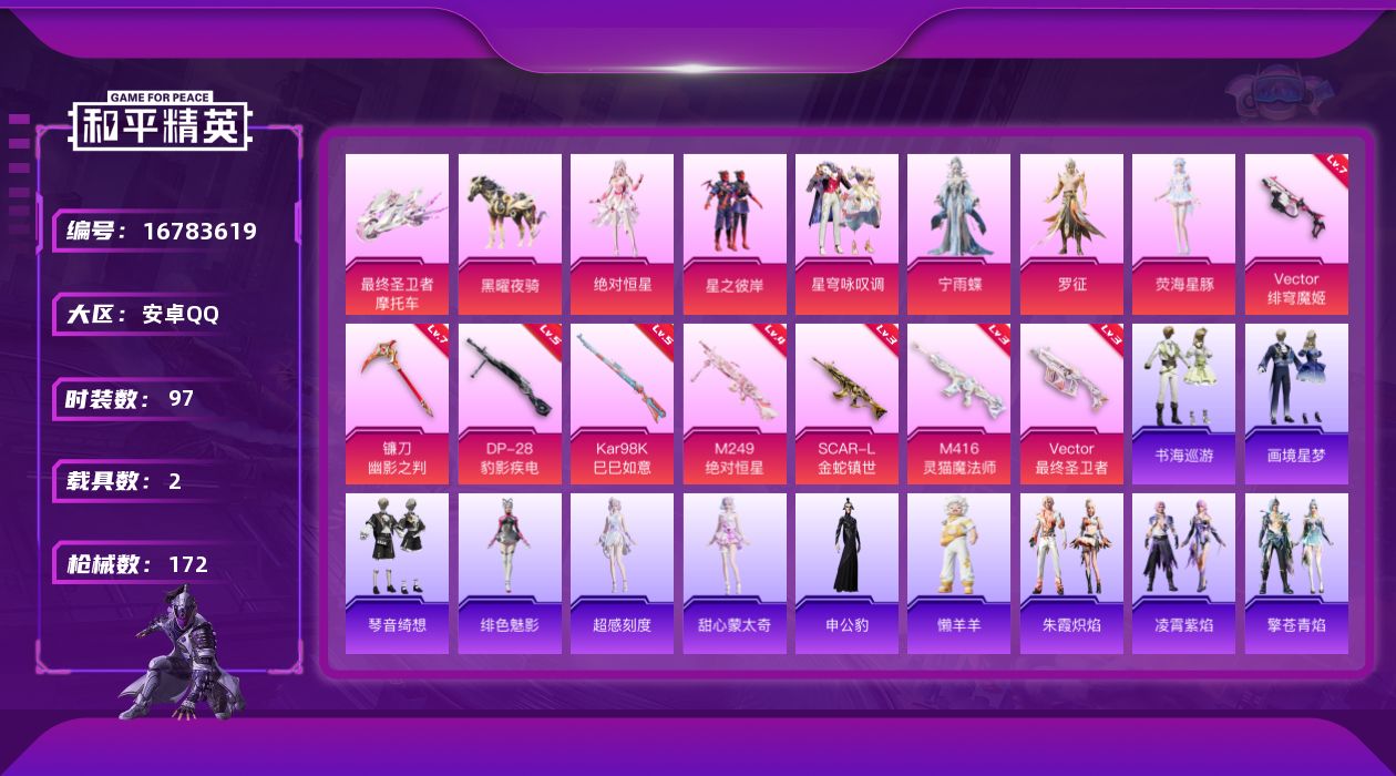 [16783619]【特价出售/店主推荐】安卓 手Q-6粉装-9特效枪-2载具-7粉色飞行器-52095热力值-3王牌印记-97套装-172枪皮【热门品类】:套装-忍者信条【粉色套装】:角色-绝对恒星,粉装-星之彼岸,粉装-星穹咏叹调,角色-宁雨蝶,角色-罗征,角色-荧海星豚【粉色枪皮等级】:SCAR-L-金蛇镇世(三级),M416-灵猫魔法师(三级),Vector-最终圣卫者(三级),Vector-绯穹魔姬(七级),Kar98K-巳巳如意(五级),M249-绝对恒星(四级),DP-28-豹影疾电(五级),镰刀-幽影之判(七级)【粉色载具】:最终圣卫者摩托车,黑曜夜骑【粉色枪皮】:SCAR-L-金蛇镇世,M416-灵猫魔法师,Vector-最终圣卫者,Vector-绯穹魔姬,Kar98K-巳巳如意,M249-绝对恒星,DP-28-豹影疾电,镰刀-幽影之判【粉色飞行器】:绝对恒星飞行器,雀灵庇佑飞行器,终晖之翼飞行器,灵猫魔法师飞行器,飞天猪飞行器,极意拳锋飞行器